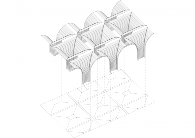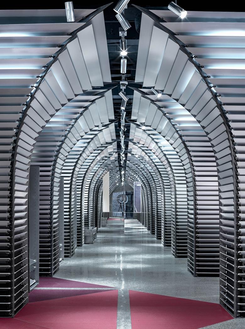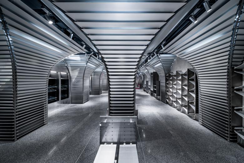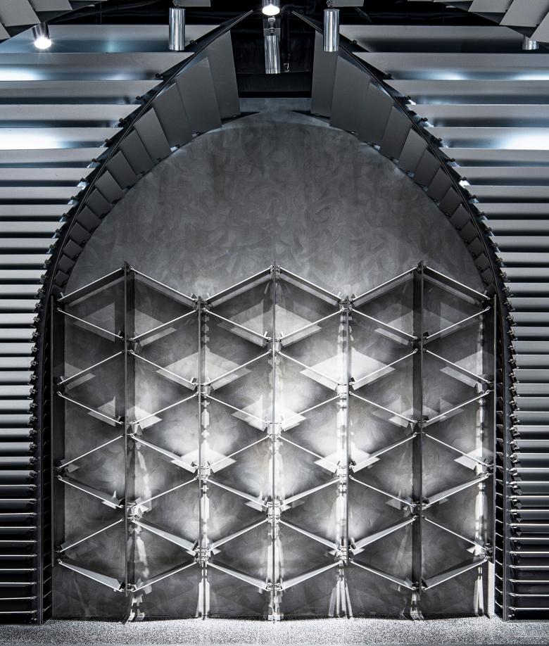 Walls at two sides of the space are made of mirror-finish stainless steel and concrete. These materials create another space in mirror. The mirror effect widens the space and multiplies the number of umbrella columns, giving a stronger sense of order. Another optical illusion of depth is created by overlapping joint lines of the terrazzo floor with the orthogonal projection of the umbrella-shaped system and changing terrazzo mixture. One may notice that the floor gradually switches colors. To match the style of the floor, the whole surface of stainless-steel walls shows a gradient effect from mirror-like finish to matte finish. This is achieved by a hand-crafted polishing method that changes polishing pressures at different parts of the walls.