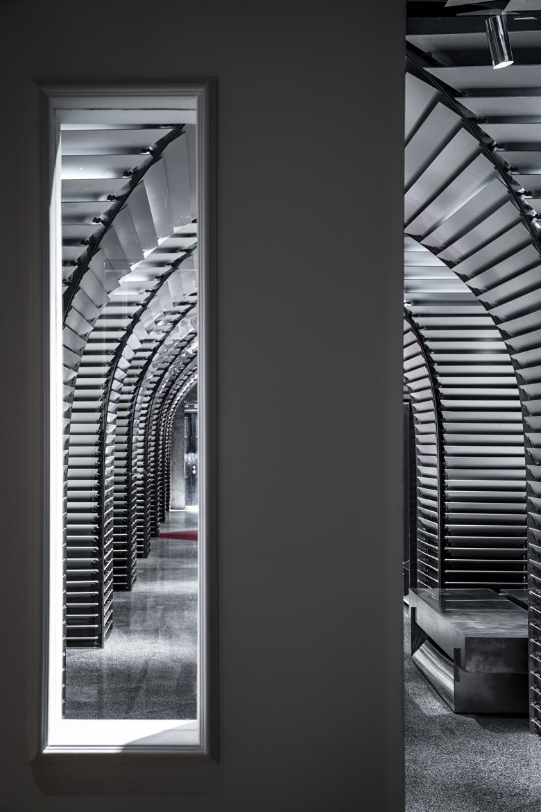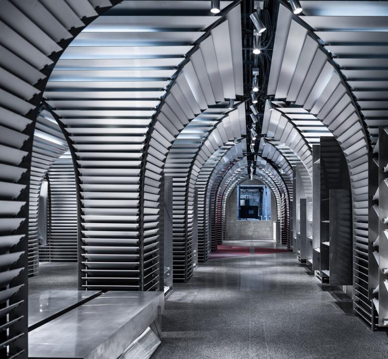 The original building had a row of columns at the center that might negatively affect retailing. After careful consideration, dongqi Architects decided to strengthen the presence of the columns to give an impression of orderliness. They designed and added two more rows of columns to form an umbrella-shaped system, which successfully reinforced the order of space. Under the umbrella-shaped system, there are relatively independent and quiet showrooms for merchandising displays. This way of display gives out a sense of solemnness and makes shopping a special experience. Moreover, it enables the access aisle to look clean and pure and brings a sense of drama to the room.
