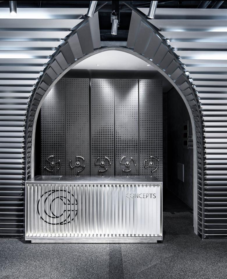 Anodic alumina slats of different shapes are fixed to each position by stainless-steel joints specially designed, prototyped and produced for CONCEPTS. Each of the specially created joints enables 3-axis rotation so as to fix materials firmly to a position and fulfil customized functions. The joints are also used to make the adjustable display racks, walls of the fitting room, doorknobs and hangers that can suit different angles.