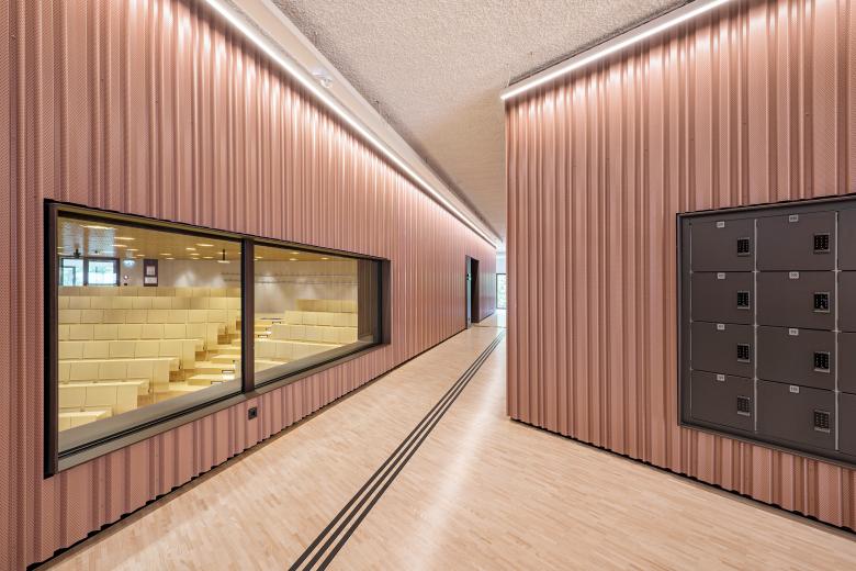 Alles im Blick – Das Foyer des Studienzentrums orientiert sich sowohl zum Vorplatz als auch zur Mur und bietet ein großzügiges Entree mit Möglichkeiten für diverse Veranstaltungen. Zwei offene Lufträume sorgen für verbindende geschoßübergreifende Transparenz und Kommunikation. Das wiederkehrende Element des Trapezblechs nimmt die horizontale Gliederung der Fassade im Inneren auf und sorgt für die erforderliche akustische Dämpfung. Alle drei Hörsäle sind über Zugänge auf jeweils zwei Ebenen erreichbar. Ihre signifikante Geometrie verleiht dem Gebäudeinneren seine unverwechselbare Identität. Die Hörsäle haben Verglasungen zu den Studierzonen, somit ist immer sichtbar, was im Haus gerade passiert. Innen bieten sie eine warme und helle Lernumgebung.