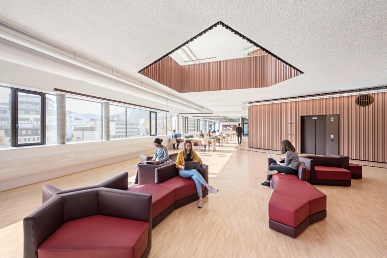 Räume dazwischen – Denn dem neuen Universitätsgebäude sind diese „Zwischenzonen“ ebenso wichtig, wie das scharf funktionale Raumprogramm. Braucht es doch für hochwertige moderne Forschung und Bildung genau diese offenen Räume für Begegnung und Präsentation, Konzentration, Lernen und Erholung. Diese offene Gestaltung fördert die Kommunikation zwischen Lehrenden und Studierenden und ermöglicht einen Wechsel zwischen unterschiedlichen Lernsituationen.