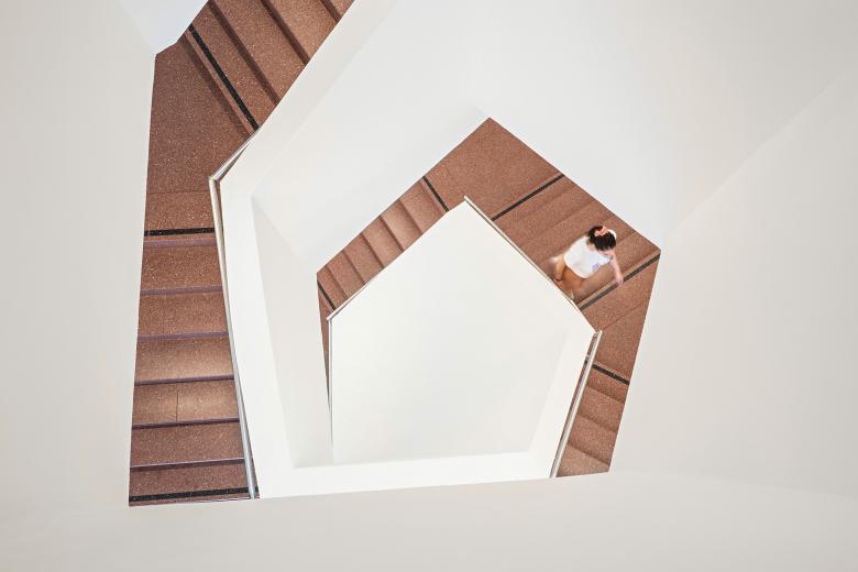 Von Schichtungen und Muscheln – Von außen wirkt das Gebäude zunächst ganz einfach. Vier Geschoße, vier Fensterbänder, alles klar ablesbar. Die Fassadenbänder sind in unterschiedlichen Dicken und Farbnuancen geschichtet. Eine Referenz an den Bergbau und die Schichtung von Gestein. Unaufgeregt, bodenständig und wertig. Mit dem bestehenden Gründerzeitgebäude tritt das neue Studienzentrum in einen freundlichen Dialog und bildet gestalterisch ein stimmiges Ensemble.