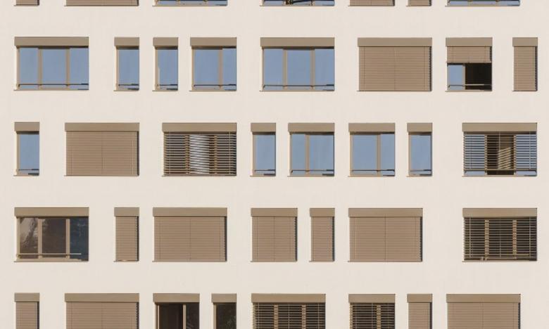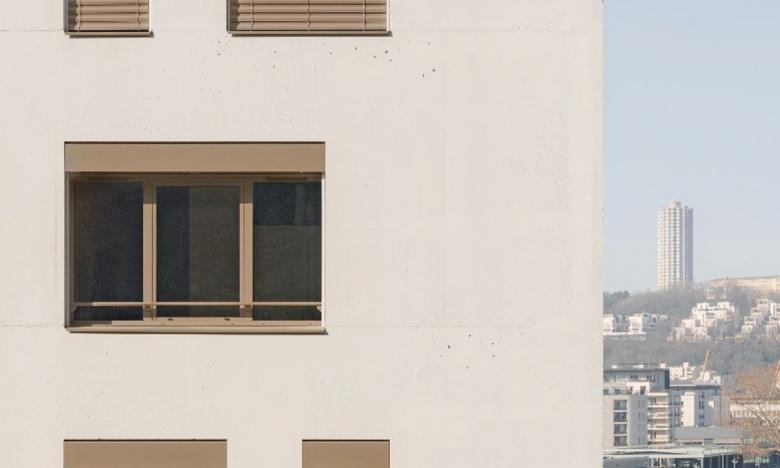 Die unterschiedlich grossen Öffnungen in der Fassade erinnern subtil an die Strudel der Saône und erzeugen eine natürliche Dynamik. Für optimalen Hitzeschutz und einenaussergewöhnlichen Ausblick wurden Lamisol-Lamellenstoren von Griesser installiert. Dieser robuste Sonnenschutz mit seiner klaren Linienführung ermöglicht einen ungehinderten Blick nach draussen, sorgt für eine optimale Regulierung des Tageslichts und lässt sich geräuschlos schliessen. Insgesamt wurden 239 Lamisol in der Farbe Beigegrau, RAL 7006, verbaut.
