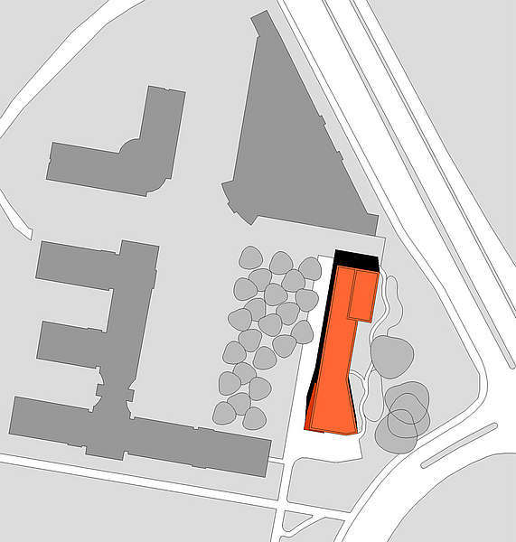 Der Eingang orientiert sich zum Platz, das Gebäude öffnet sich durch das „Auffächern“ des Südgiebels zur Stadt.