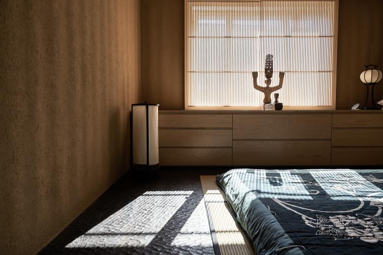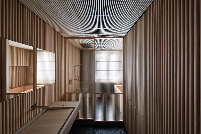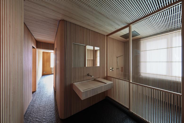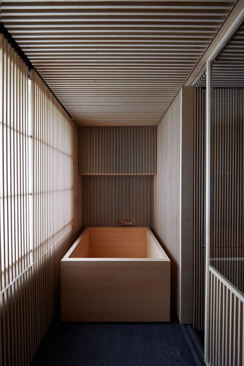 Wir erleben die Haptik und den Duft der im Rohzustand belassenen Materialien. Die Maserung des Holzes, die Struktur des Steins, der Duft der Hinoki Badewanne, der natürliche Schattenwurf, sogar die dämmrige Belichtung der Toilette, wie auch viele andere Details bringen eine besondere Stimmung und Ästhetik herbei, die im Einklang mit unserer Vorstellung von Leben und dem Fluss der Zeit stehen.