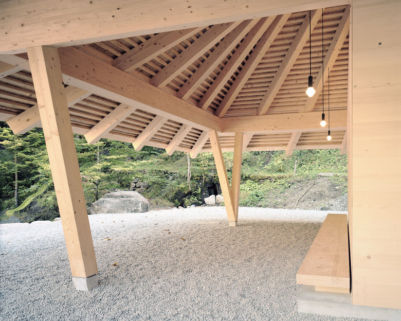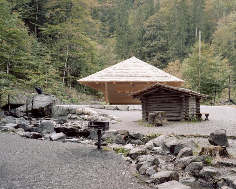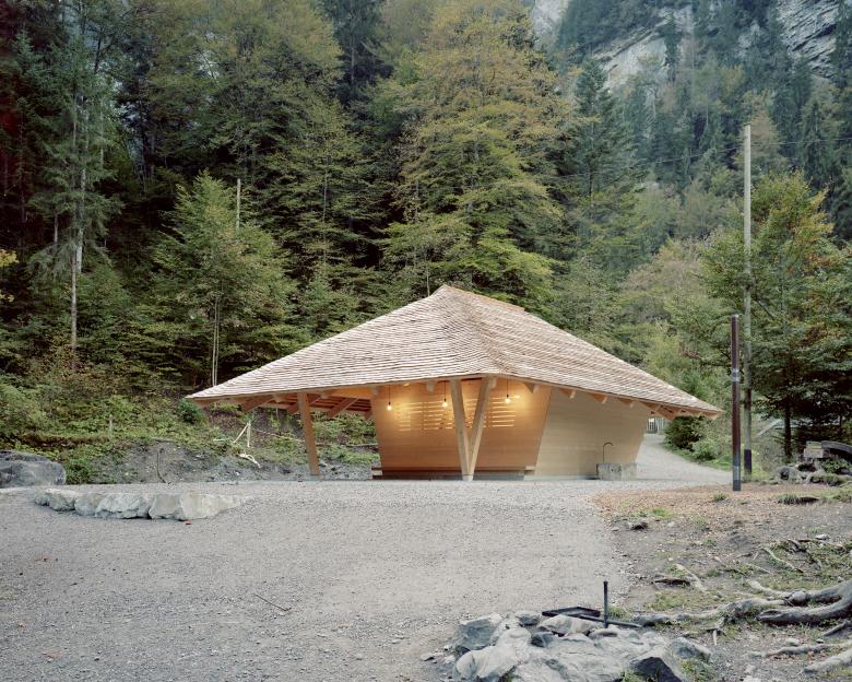 Die gewaltige Landschaft rund um den Blausee wurde vor 15’000 Jahren durch einen Felssturz geformt. Das mineralreiche Wasser verleiht dem See seine tiefblaue Farbe – und den Namen. Seit dem 19. Jahrhundert ist der Blausee eine Tourismusdestination auf der Route ins Wallis. Der kleine Pavillon nimmt die Poesie des Ortes auf und schreibt die hundertjährige Tourismusgeschichte weiter, ohne dabei in Nostalgie zu verfallen. Dabei diente das archaische Bild des grossen schützenden Dachs in der weiten Landschaft, wie man es von alten Berner Bauernhäusern kennt als Leitbild. Drei Lagen Schindeln, welche auch im Innern des Pavillons sichtbar bleiben decken das mächtige Dach. Keine Dachfenster oder Sanitärrohre durchstossen die kompakte Konstruktion und zudem wurde auf eine Dachrinne verzichtet. So bildet sich an einem regnerischen Tag entlang der Traufkante ein Vorhang aus Wassertropfen.