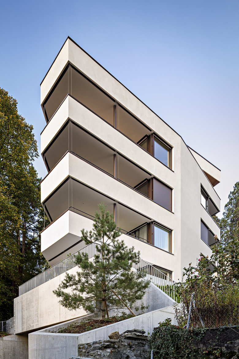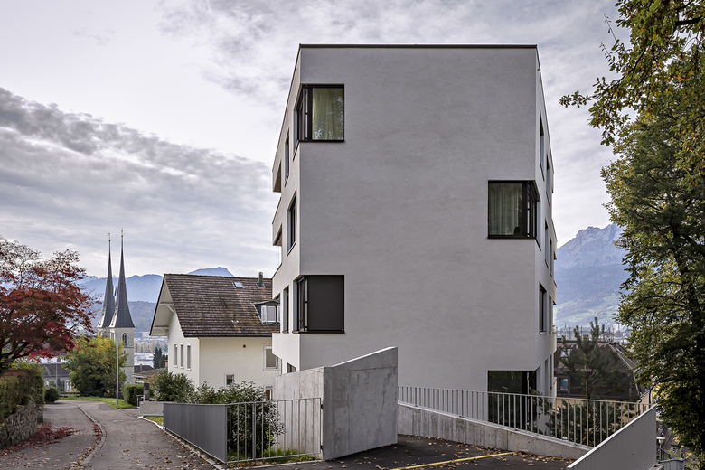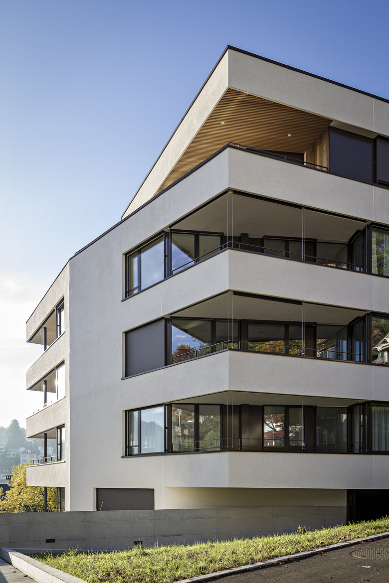Der Footprint des Gebäudes kommt in Form eines Polygons daher, welcher einerseits präzise auf die Geometrie des Grundstücks reagiert und andererseits das Gebäude gegen die prominente Seite mit Aussicht und Besonnung auffächert.