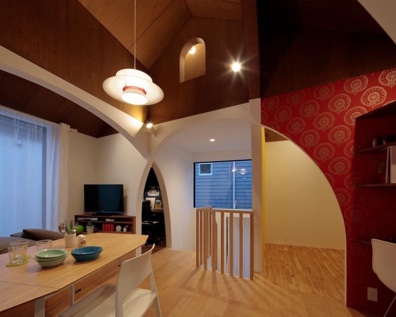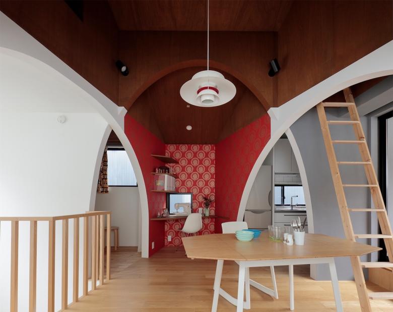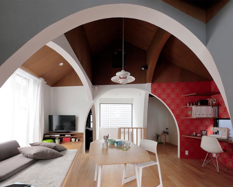この小さな住宅は1冊のスクラップブックから始まりました。小さいスペースでも良いからたくさんの部屋が欲しい。 そこで過ごす自分だけのお気に入りの時間が過ごせる豊かさが求められていました。この個性的な小さな居場所での出来事が、クライアントの要望であるアーチの空間を活かして、生活の中で流れるように場面展開されていく構成としました。