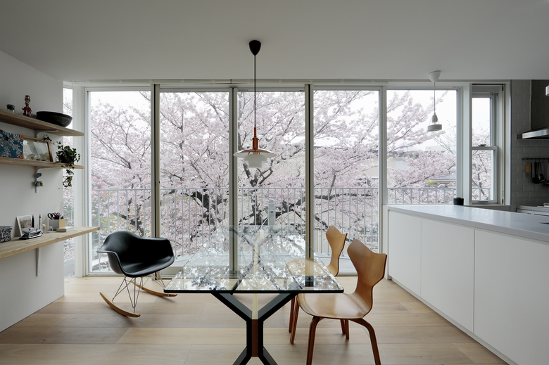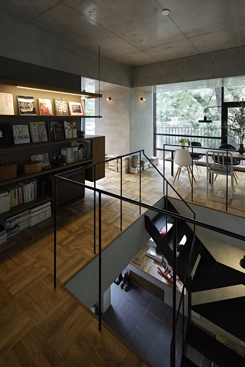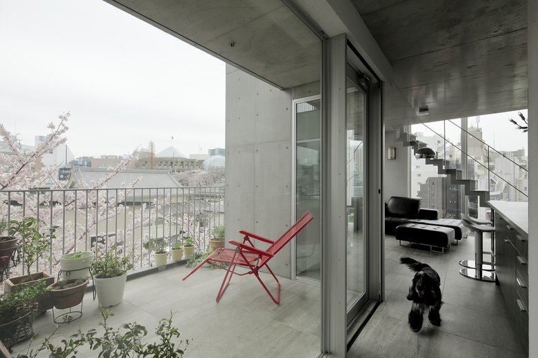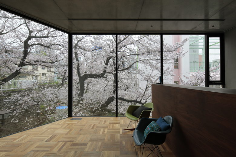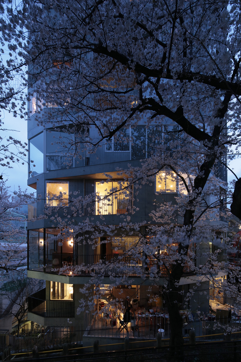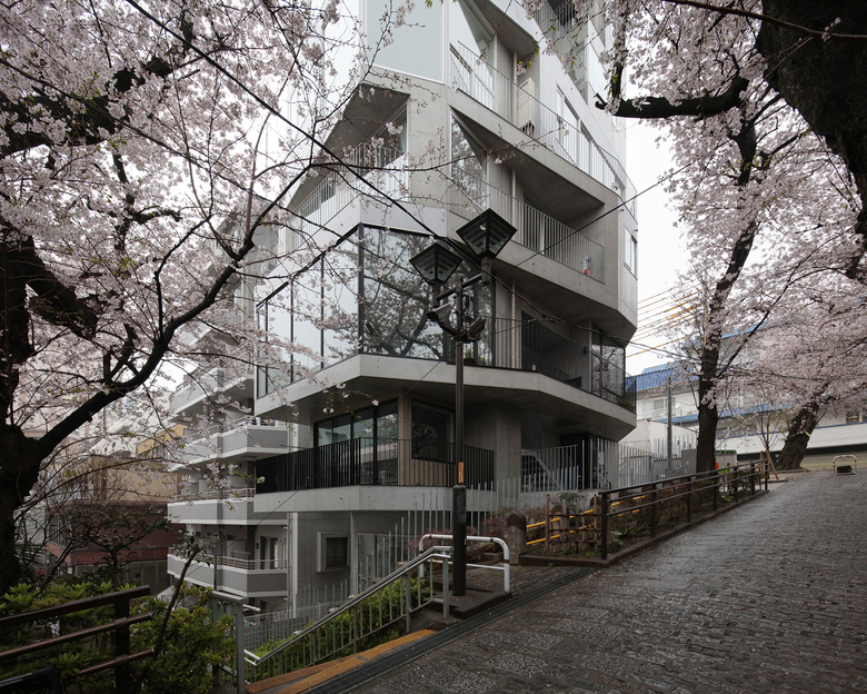 都心の駅から至近の利便性と共に、区の保存樹に指定される桜並木の緑道沿いに位置する計画地は、魅力的な外部環境を携えていた。「みんなで建設して集まって住む」というコーポラティブハウスの与条件を最大限活かすため、10枚の床を10個の敷地を見立て、10通りの家と庭をセットして垂直に重ねた。構造フレームを工夫することで全ての外壁を雑壁として扱い、住む人自身が外壁や開口部の位置を自由に決めていく。外壁が自由ということを利用し、途中、半数がメゾネット住戸となる10層8住戸の建築に改造された。どの庭も生活の幅を広げていけるような特徴をもち、共有のEV/階段/大きな吹抜けにより、立体的に繋がっていく。