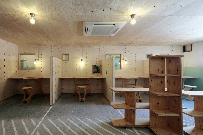 築53年の元工場の改修。かつて生産の町であった工場街に、fab工房をベースとする生産と消費を内包した創造複合拠点として計画しました。1階に入居するfab工房と共同し、工房で木材を切り出せるサイズに全体の設計をアジャストし、施設内の内装から扉、屋台や家具に至るまで制作しました。全体は5階建で、内外が地続きとなった1階にはオープンカフェ、3・4階には、スモールオフィスの複合するシェアワーキングスペースが入っています。共有部や木のコンテンツの作り方により、使い手が使い方を自由に発見し続けられるような、大らかな環境となりました。