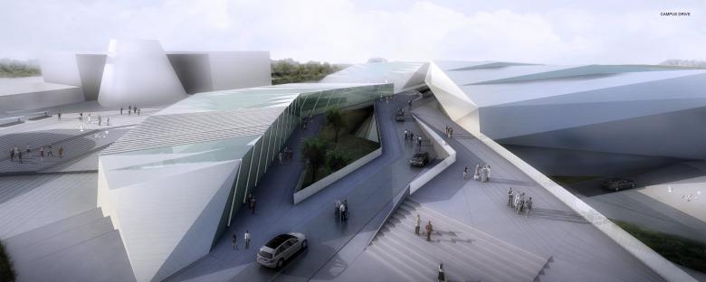 Tectonics and appearance are driven by the contrast between the textured stone and concrete of the landscaped surfaces and the crisp, highly refined metal and glass of the facades and roof lights. The intersections of the loops with the main building volumes are articulated as a series of carved voids. In those locations as well as the entrances, the planar geometry of the buildings becomes eroded and replaced by double-curved glass membranes that offers radically new and rich experiential moments.