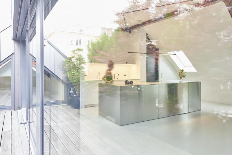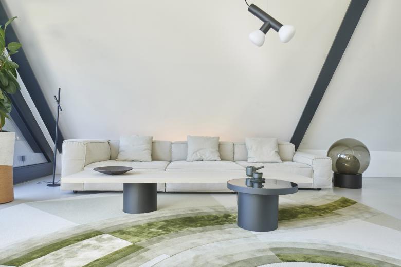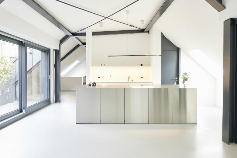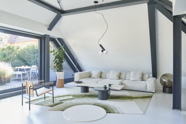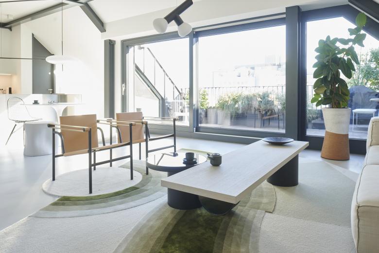 Die detaillierte Farb- und Materialauswahl, die Integration von Objekten sowie der minimalistische Stil, der den Innenarchitekten auszeichnet, haben dieses Industrial Loft im Zentrum der Stuttgarter City zu einer wahren Oase gemacht. Es war ein langer Prozess, in dem maßgefertige Möbel wie „Rueda Table“ oder „Frontera Rug“ entwickelt und andere wie die Schaukel „Luna Chair“ integriert wurden, alle genannten Produkte sind Teil der Kollektion von Möbeln und Accessoires der Designerin Milena Romero.