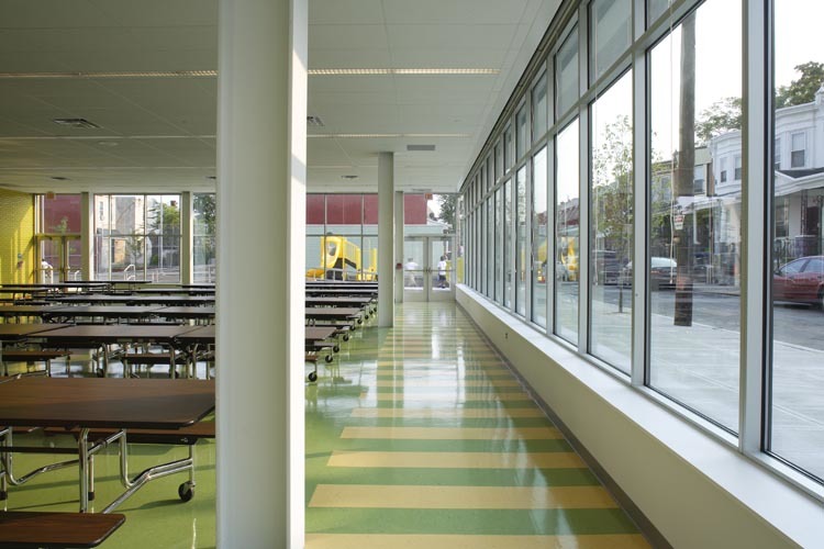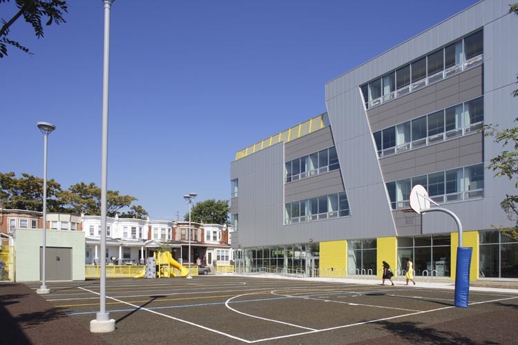 The new Commodore John Barry Elementary School accommodates 646 students from pre-kindergarten through 8th Grade on Philadelphia’s west side. The site is bounded on all four sides by 2 story brick row houses, dating to the early 1900’s.