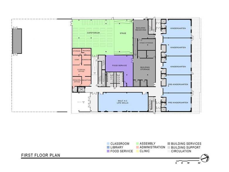 The new school contains 46 classrooms. Additional instructional spaces include Art, Science, Vocal Music, and Technical Education. The building contains a Cafetorium with a stage area and Warming Kitchen, a Gymnasium with locker and shower areas and an Instructional Media Center, containing a computer classroom, conference rooms and a library.