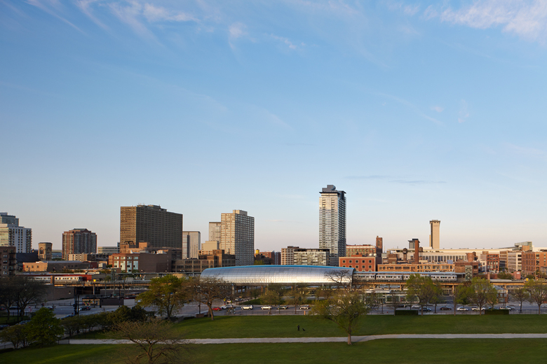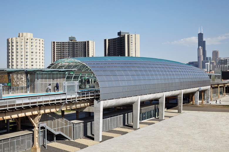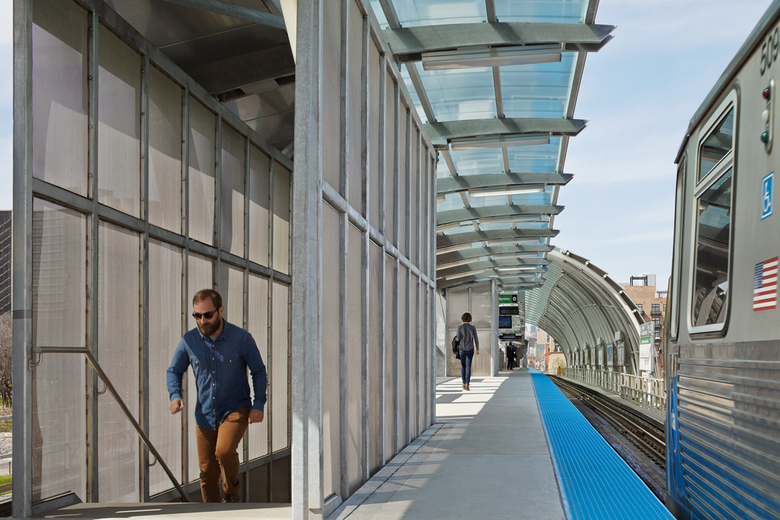 The Cermak – McCormick Place station serves the country’s largest convention center and a stretch of the Green Line that has been without a station since 1978. The innovative design, a tube covering the platform and tracks, is the result of creatively working within the constraints: The station is to be built quickly, with a modest budget, without suspension of service, and of durable, low-maintenance materials. This portion of the Green Line runs within city blocks on a narrow right-of-way. Tracks could also not be moved and, as a result, narrow platforms would have to serve trains in an area with an anticipated growth in population and transit use. In addition, the client, the City of Chicago Department of Transportation, wanted a “gateway” treatment for this station that is anticipated to serve a high number of first-time visitors to Chicago. A resolution of the demands of the project — Low-cost, speedy construction, no track relocation, narrow right-of-way, and a memorable gateway – was the development of a tube over Cermak Road. Cermak Road is where the CTA right-of-way is widest and most visible to the public. Locating the primary berthing for trains over Cermak Road allows for views to Chinatown, McCormick Place, and Chicago’s Loop. The perforated stainless steel and polycarbonate tube performs multiple duties: Wind and rain protection and their supports are kept off of the platform, creating more comfortable and usable space for riders; materials are moved out of easy reach of vandals; and the station is easy to identify from a distance. Glass, polycarbonate, and perforated stainless steel are used to maximize visibility, views, and natural light in the station houses and on the platform. For ease of maintenance and durability, glazed masonry units and granite are used for the interior walls and floors.