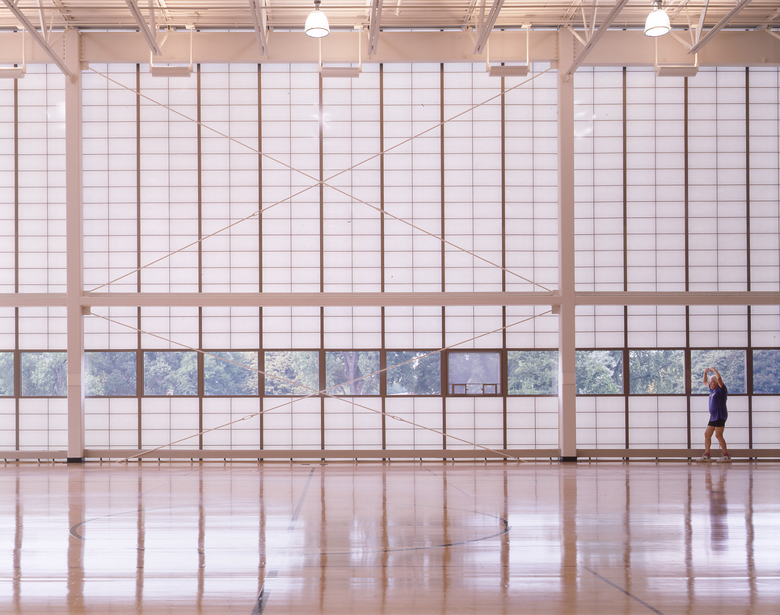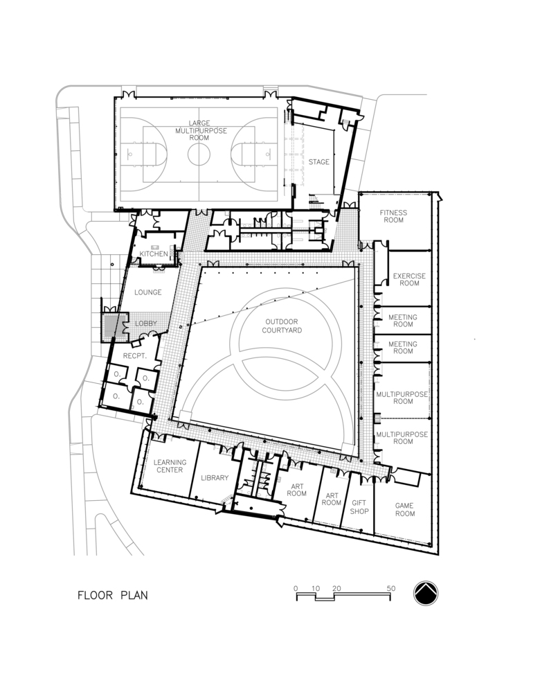 The 25,500 square foot, $6 million center has three components: the glass enclosed classroom wing shielded by a 13’ high wood louvered screen providing and allowing views through and into the park; the multipurpose gymnasium/theater constructed of light transmitting, fiberglass panels and offices and support spaces clad in brick and aluminum.