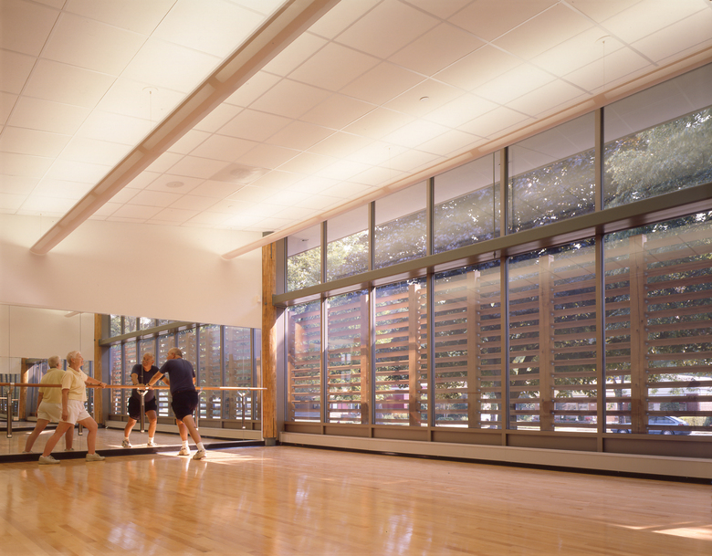 Natural materials were selected for durability, accessibility and sustainability. A slate border around the courtyard arcade provides a tactile warning and high contrast definition for users who are visually impaired. The wood louvers are built from sassafras, a weather resistant sustainable harvested species that allows daylight while protecting the occupants from the glare and heat of direct sun radiation.