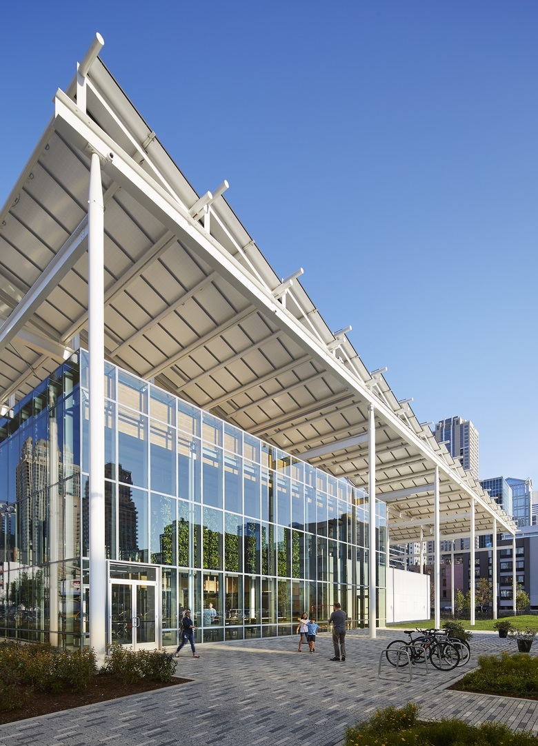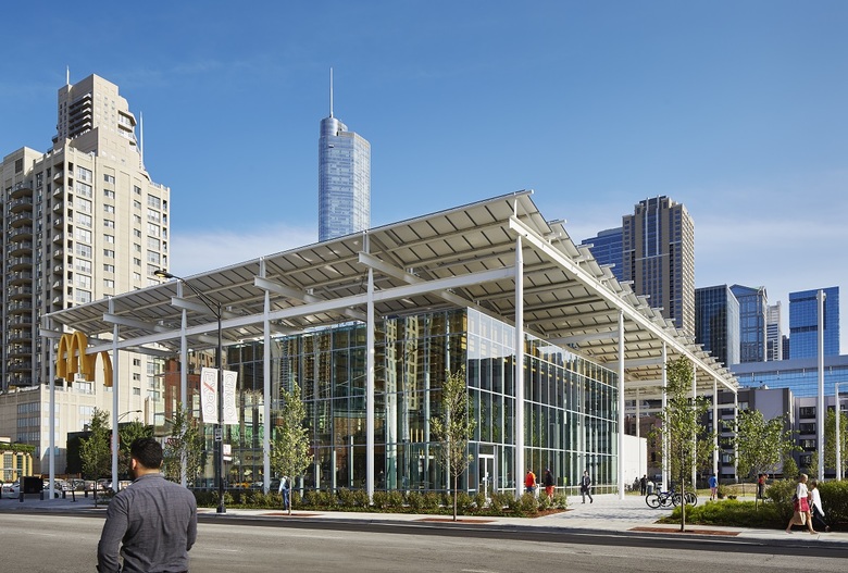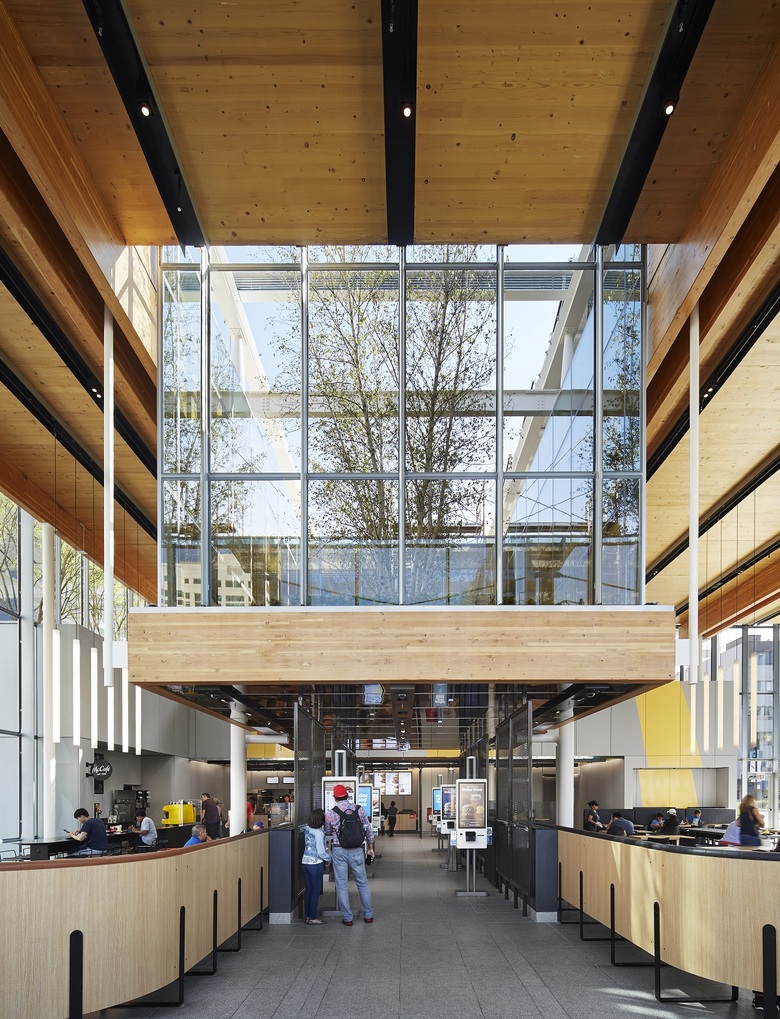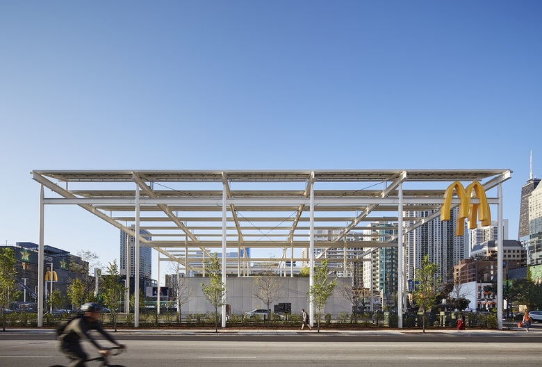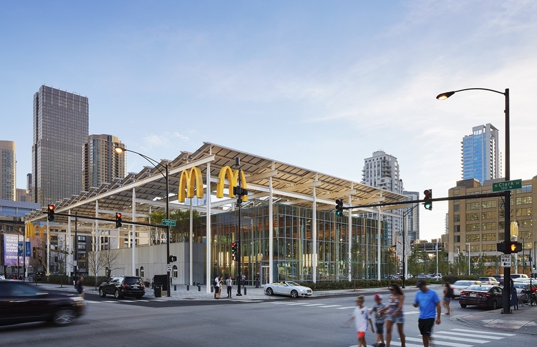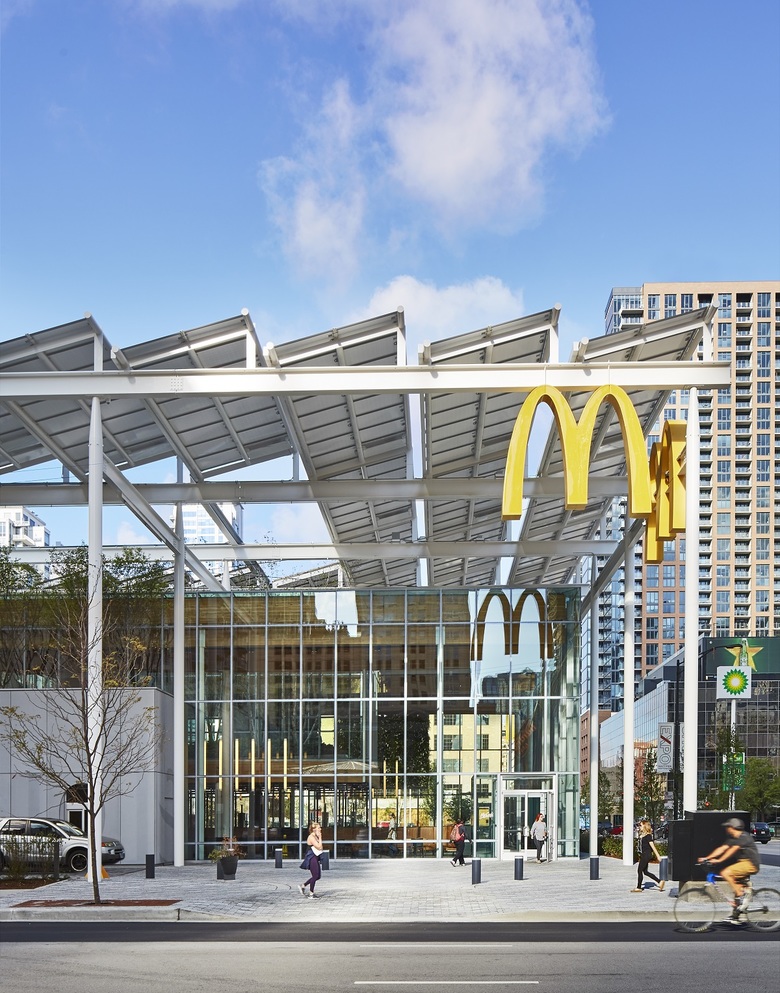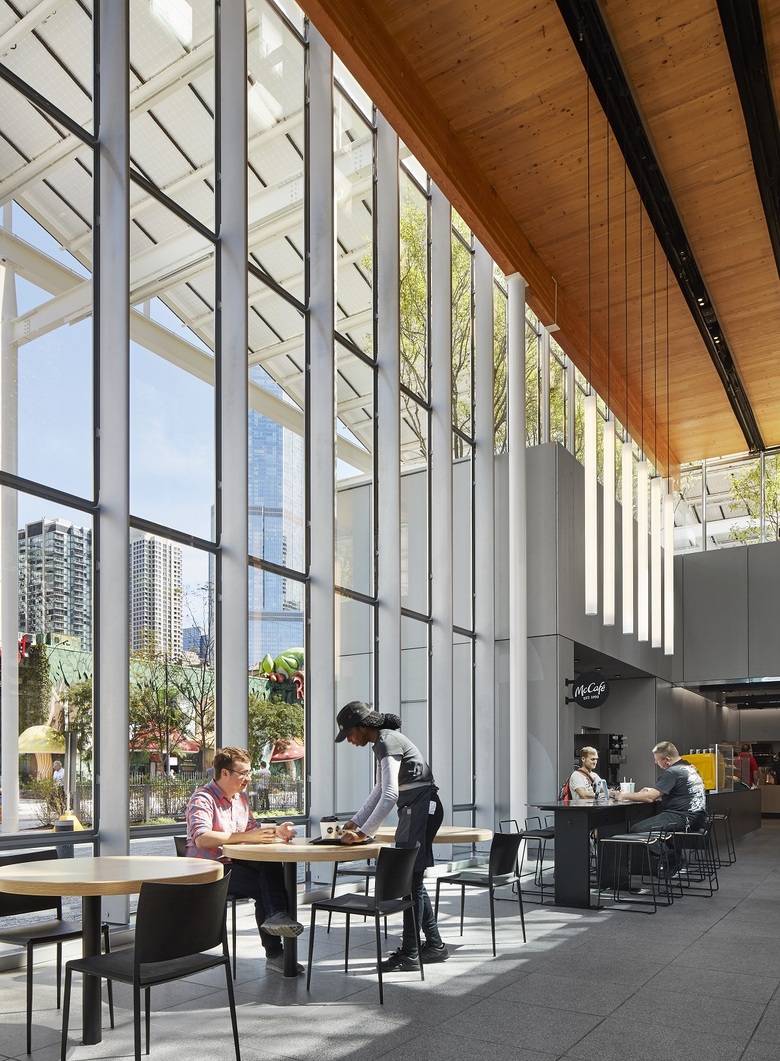 McDonald’s corporate commitment to “make sustainability the new normal” is at the core of the new restaurant design. The structural system, Cross Laminated Timber (CLT), is the first commercial use in Chicago and has a lighter environmental footprint than concrete and steel. The solar pergola captures the sun’s energy, supplying part of the buildings consumption needs. Throughout the site, permeable paving is used to reduce storm water runoff and the heat island effect. The building is designed to achieve LEED certification.