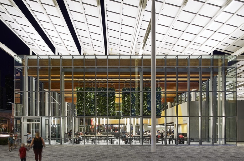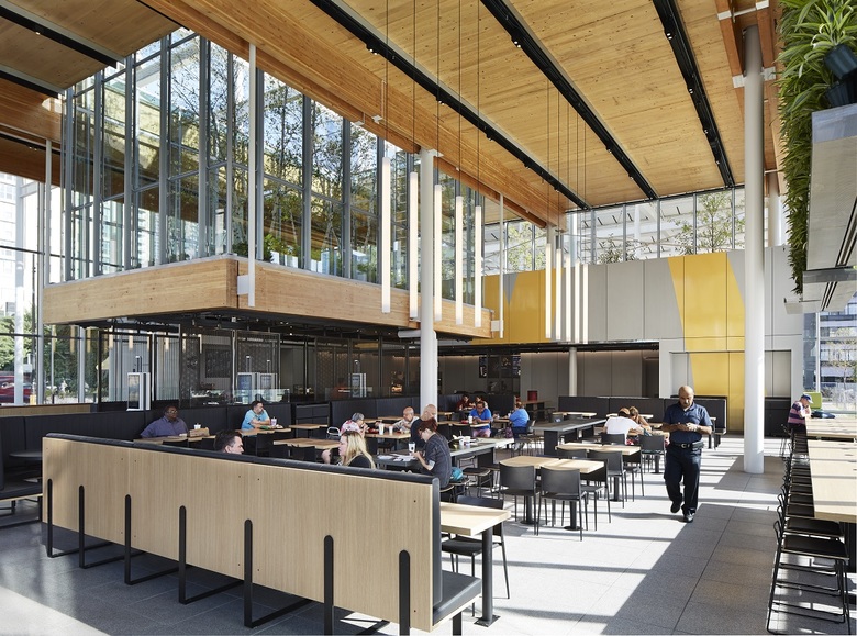 The dining room features a garden planted with ferns and white birch trees floating above a digital ordering “street”. From this vantage point guests can experience the landscape beyond and above. Over shared tables with wireless charging and outlets, “tapestries” of living plants improve indoor air quality and provide a backdrop of green gradients. What might surprise many can be found on the adjacent kitchen roof: a row of harvestable apple trees can be seen through a clerestory window, telling a story about the future of urban farming and the utilization of often underused space.