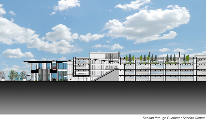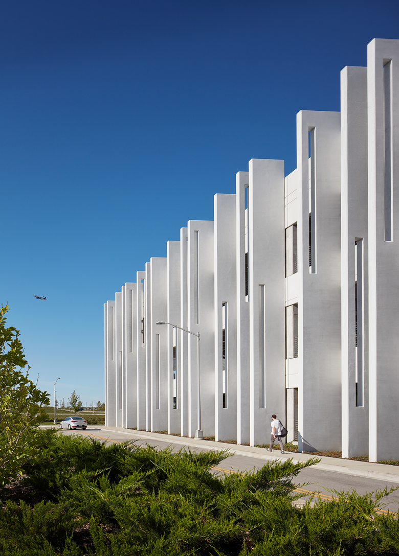The five level, precast concrete parking structure contains a consolidated rental car center (CONRAC) with 4500 ready/return car capacity, and a multi- level, quick-turn-around fueling and wash facility (QTA), and public parking for 2600 cars.