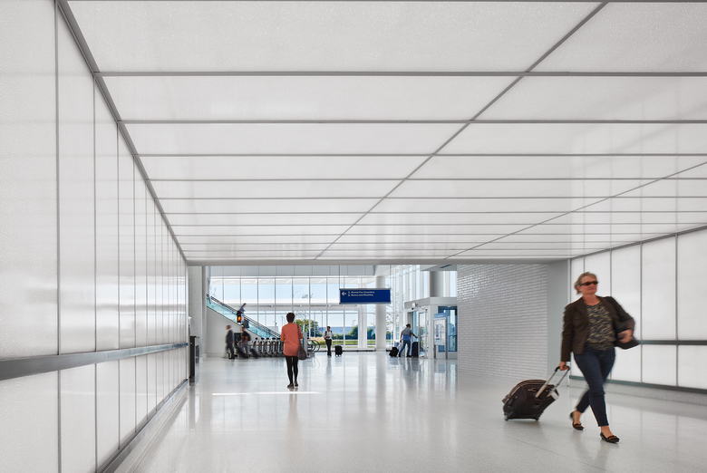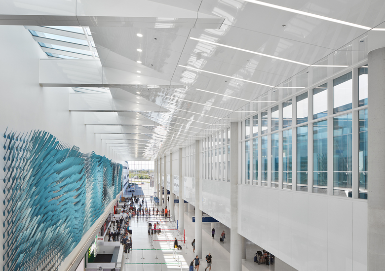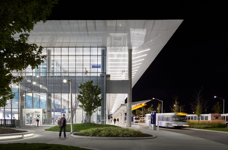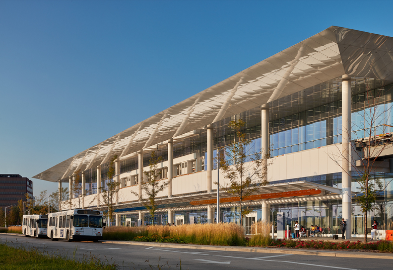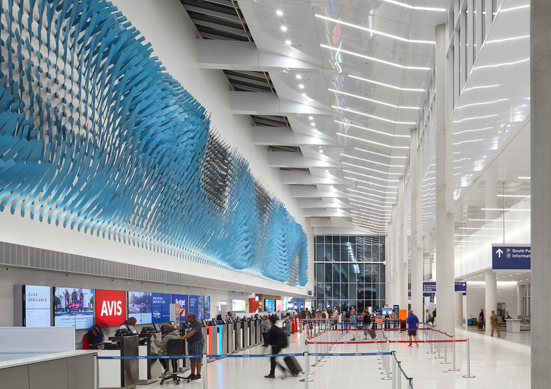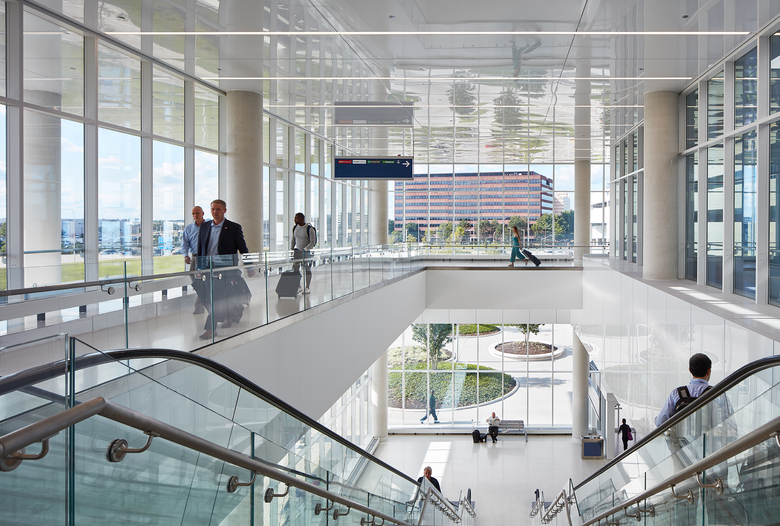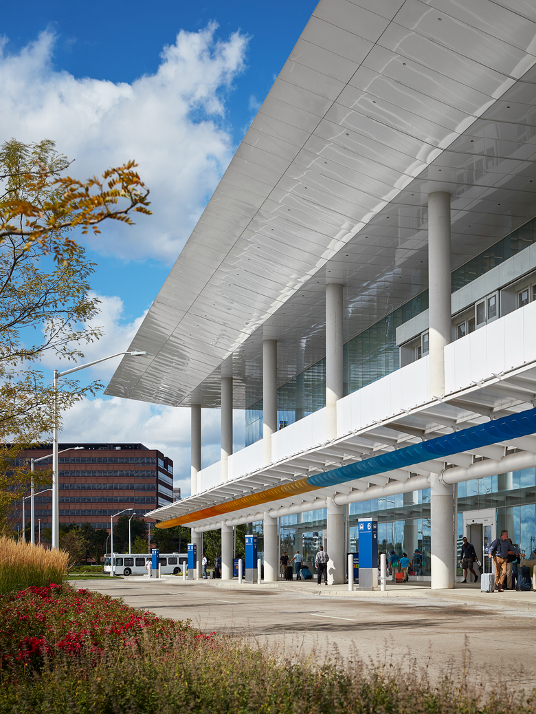 The soaring, sun filled terminal serves the customers of 13 rental car companies, regional buses and hotel shuttles. Passengers can also access suburban train services. Amenities include food, beverage and merchandise concessions. The City of Chicago commissioned original art for the project including Horizon Light by James Carpenter, Field Lines by Rob Ley and Sound Suit by Nick Cave.
