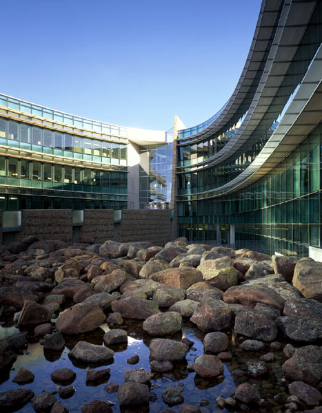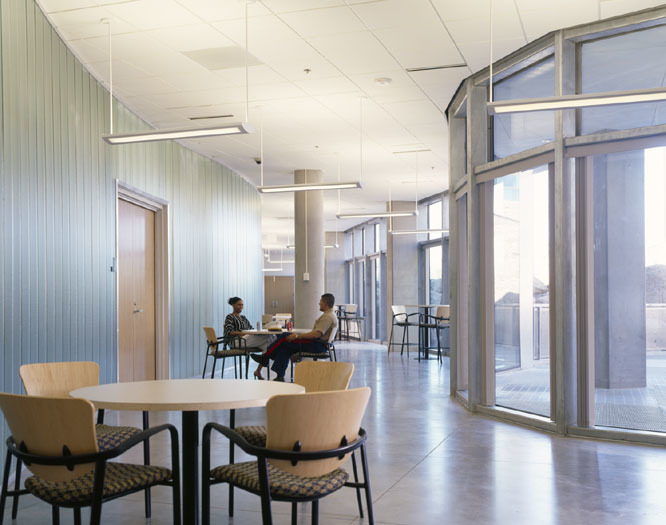 The design of the new Federal Building in Oklahoma City maximized sustainable design and workplace productivity initiatives. Most expanses of curtainwall in the building are oriented to the north, northeast, or northwest and have horizontal shading elements to limit the impact of western summer sun and redirect daylight onto interior ceiling surfaces. The southeast facing curtainwall is protected with a combination of shading elements and a deep roof overhang. The building was designed to receive a LEED Silver rating.
