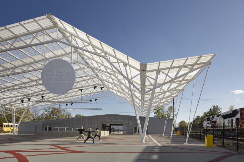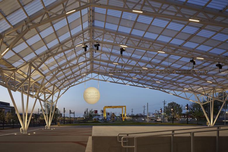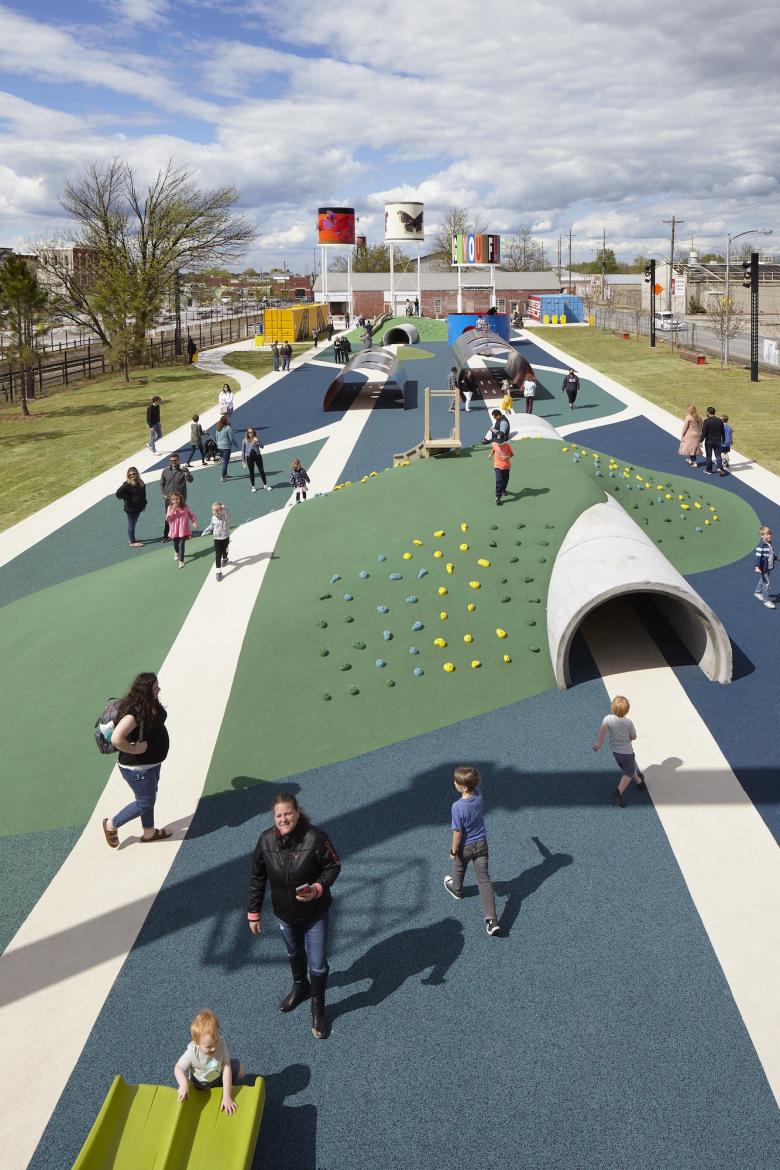 Rogers, as a city, has been defined both economically and physically by the railroad. The first plat of survey, completed in 1881, uses the rail to create a strong dividing line. The park’s design ignores the rail as a barrier and stitches the east and west together. The result is a series of plazas that can transform throughout the day, week, month, and year. These versatile and flexible spaces create a new and distinct rhythm that extends beyond the park into adjacent streets.