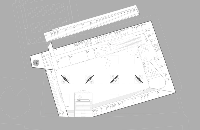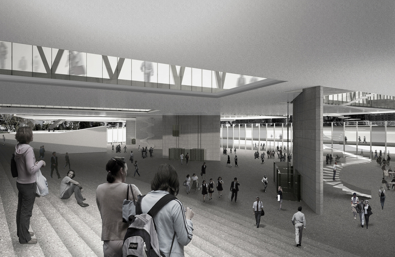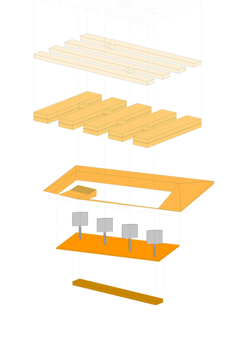 Il basamento è invece un’opera di terra, che modifica la topografia del terreno. In un unico gesto scava una grande arena pubblica: unitamente il tetto e il basamento definiscono un nuovo ricco spazio pubblico multifunzionale aperto alla città.