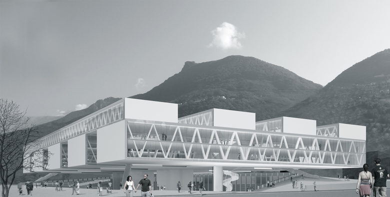 Il progetto per il nuovo Campus USI a Lugano è un tassello che si aggiunge ad un sistema esistente di spazi pubblici lungo le sponde del fiume Cassarate, che attraversa la città. Tramite un intervento unitario per l’intero lotto, che si realizza nella scelta di un grande tetto, integra la scala territoriale. Inoltre grazie ad un intervento compatto che si realizza in un basamento unitario, il progetto risponde alla scala urbana e la integra.