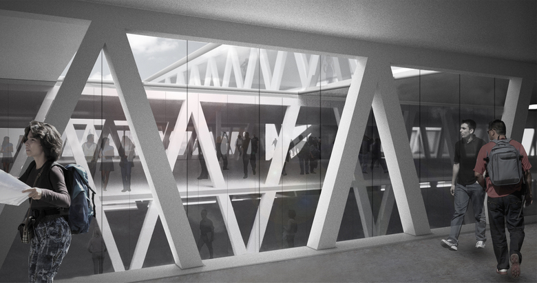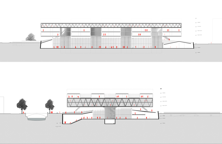La sopraelevazione di gran parte del programma garantisce la fruibilità del piano orizzontale dello spazio urbano creando un grande vuoto aperto e strutturato per la comunità.