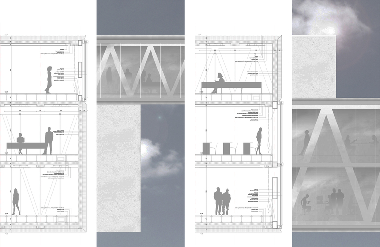 La parte adibita allo studio e al lavoro intellettuale – uffici, aule e laboratori – è rialzata da terra, come una nuvola, formando una sorta di città ideale del sapere.