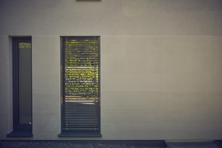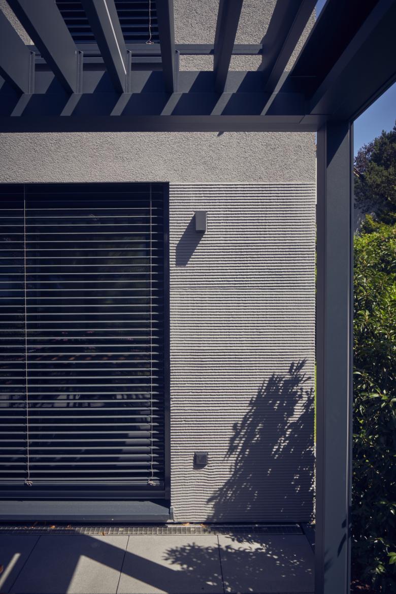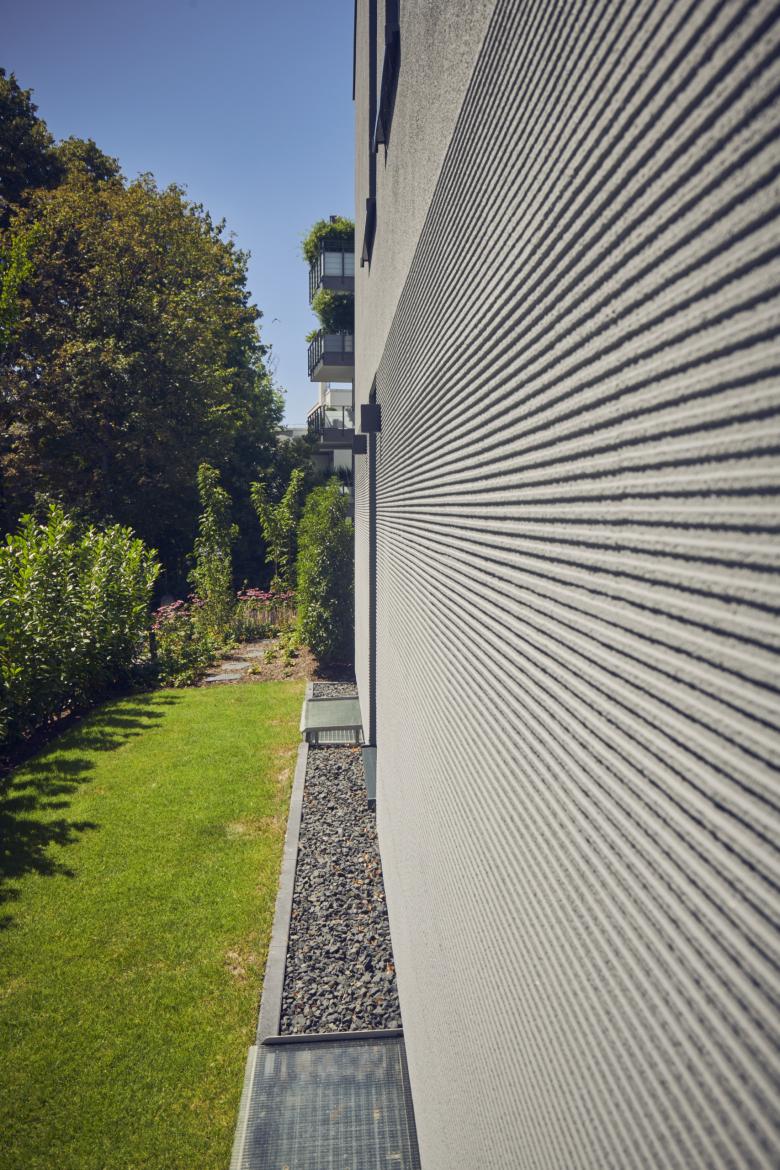 Besonderes Markenzeichen des Projekts ist die Kernidee der Fassade im Erdgeschoss: eine Putzoberfläche in horizontalem Kratzputz, exakt umgesetzt in Zusammenarbeit mit dem Hersteller Sto. Diese Detailentscheidung verleiht dem Haus eine reduzierte, moderne Erscheinung und sorgt für eine charakterstarke, zeitlose Ästhetik.