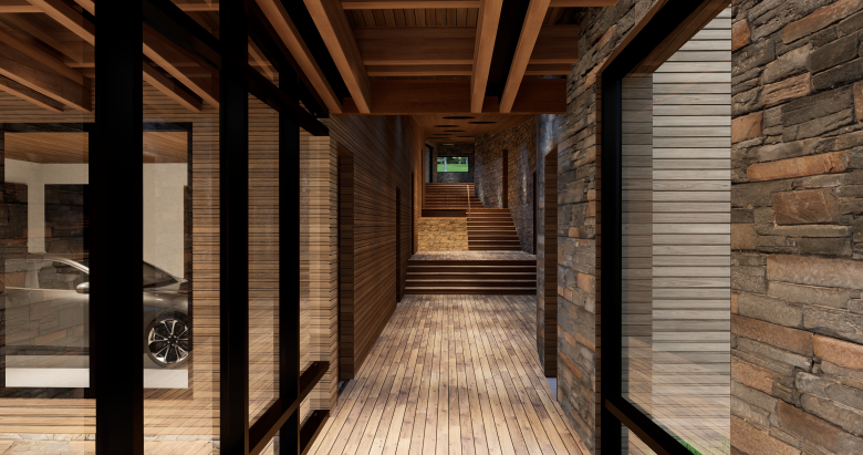 The entrance level begins at the lower portion of the site, guiding your gaze upwards, gradually unveiling the final highest space, the master suite, nestled amidst the upper topography. These two bookend spaces, along with the intermediate spaces, are organized by a central circulation spine defined by two walls running perpendicular to the slope. A series of stairs and landings, each precisely positioned to align with the natural topography, places each space at grade, establishing an intimate connection at every level.