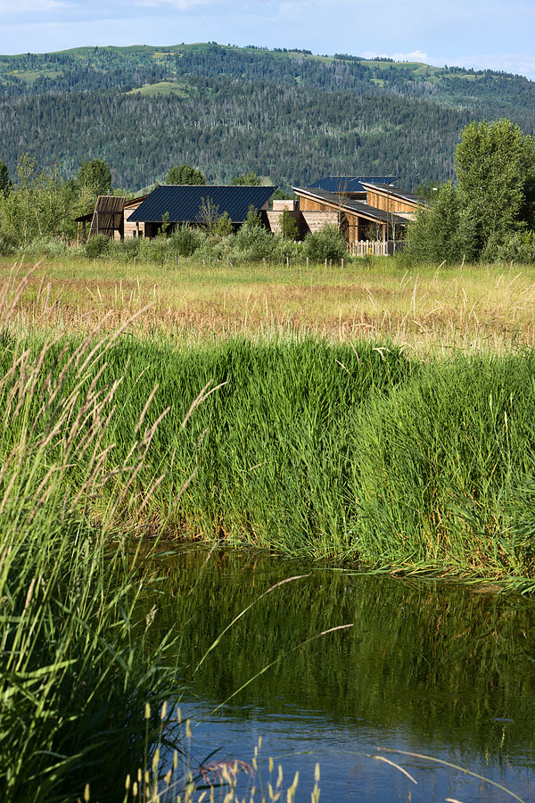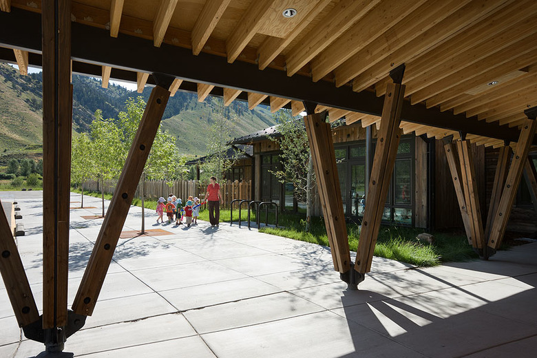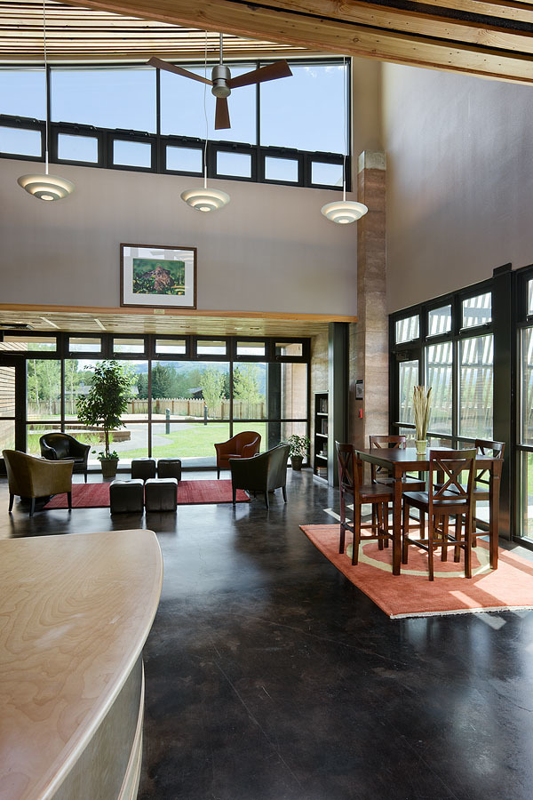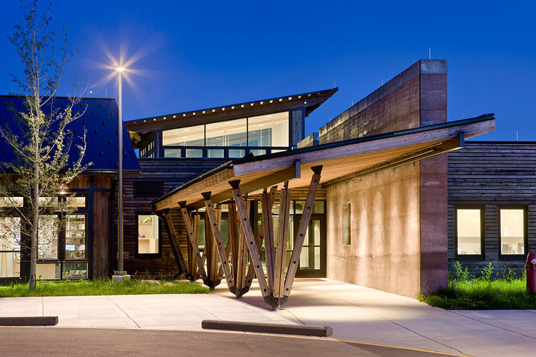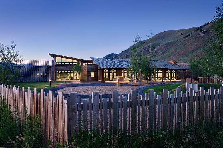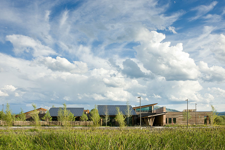Mining iconic design motifs such as beaver slides, time-evolved ranch outbuildings, and horizontally-slatted fence lines for inspiration, the 12,000-square-foot facility is cleverly broken down into smaller masses that reference these differing motifs. While a beaver slide-like enclosure over the stairway occupies much of the south elevation, it converges with a horizontally slatted wall that moves the eye easily across the structure.