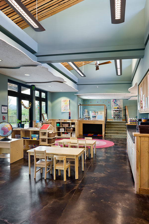 In collaboration with Boston-based childcare design experts D.W. Arthur Associates Architecture (www.dwarthur.com), our team created a facility that explicitly educates and stimulates children through its design. With a threefold objective, the Rafter J Childcare needed to fit contextually into its ranch like neighborhood, achieve a minimum LEED Silver rating, and experientially stimulate its young users.