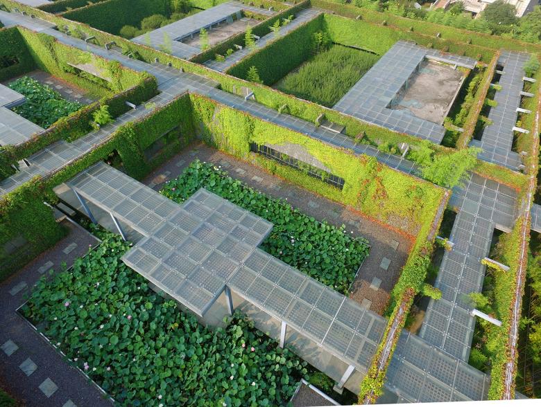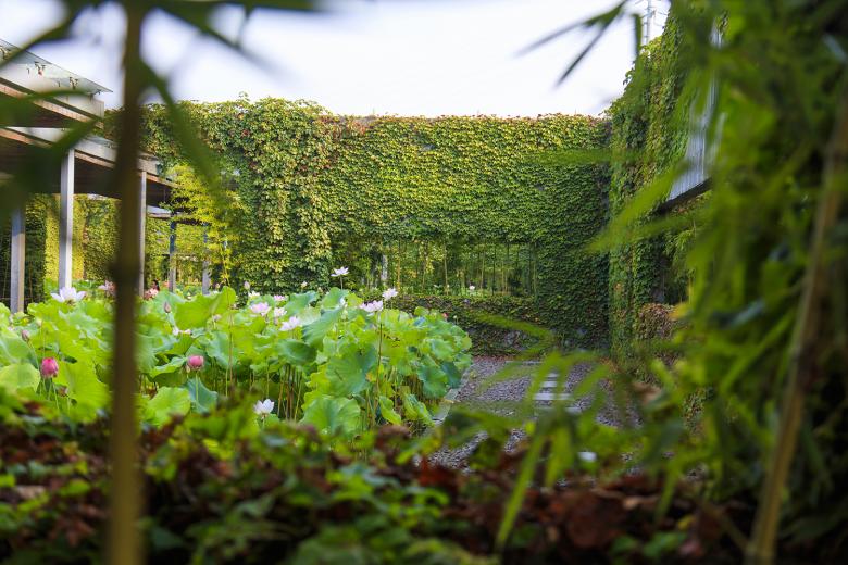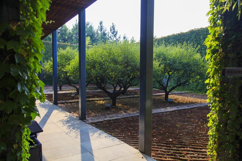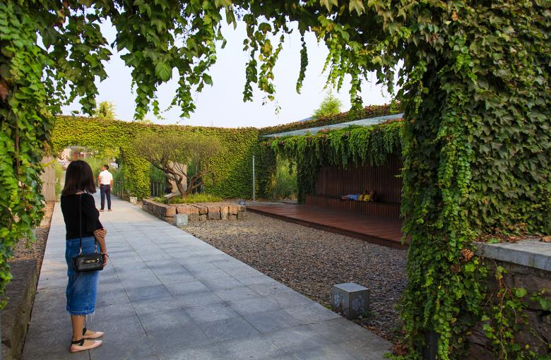 (3) A matrix of boxes hiding the famous flowers: At the end of the creek and after the water is cleansed by the constructed wetland, the water runs through a matrix of nine boxes and front and rear clearings. The boxes are 4.5 meters (about 15 ft) high and 24X24 meters (about 79 ft) in size. 6 boxes are designed to exhibit Mei Flower of various cultivars; each box is floored with one of the local materials, including black or red tiles, black or red bricks, or white or red gravel. Three boxes in the middle row are water gardens filled with lotus, another poetic flower highly appreciated in Chinese tradition that symbolizes cleanliness and purity despite the dirty environment. It blooms in the summer and has magnificent foliage that is appreciated all through the seasons, and even in winter when its foliage is withered. The black walls are largely covered with Parthenocissus tricuspidata, an creeper plant that grows to cover surfaces and displays brilliant red and golden colors in the fall The individual boxes are interconnected through a network of corridors that are integrated with awnings, providing shade and protecting visitors from rain, creating a comfortable experience even during the sweating hot summer and sticky rainy days. The foliage covered walls are pierced with viewing windows that are inspired by the Chinese traditional garden walls to create a porous landscape.