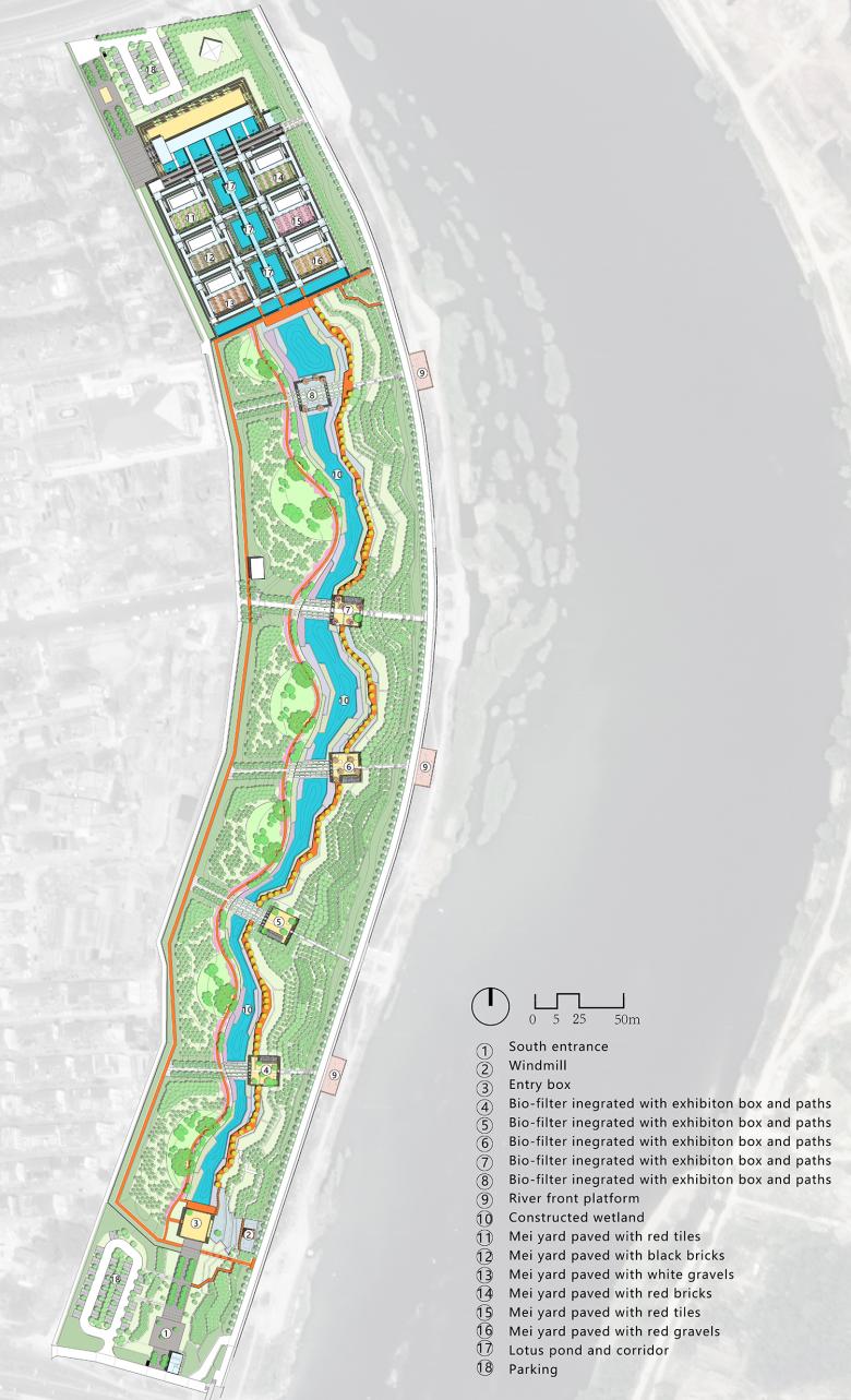 In addition to the spaces created as such, a network of paths and an environmental interpretation system is designed that explains the ecology of water cleansing processes, the science of rehabilitation, and information about the Mei Flower.