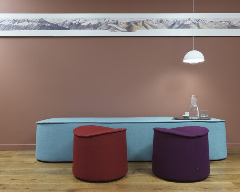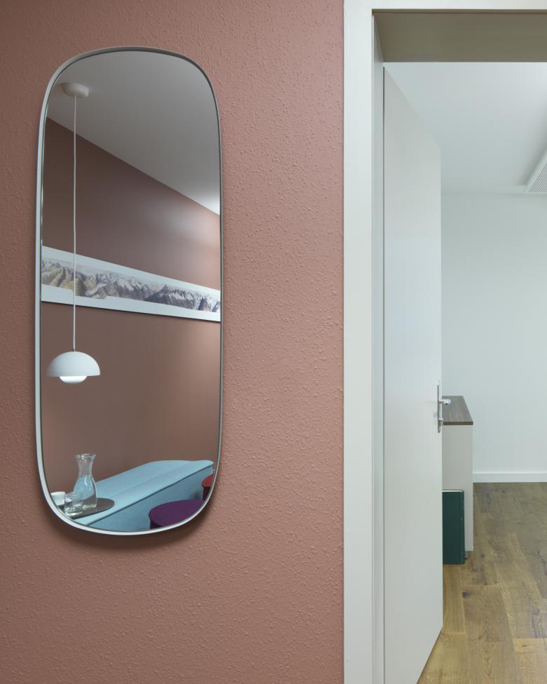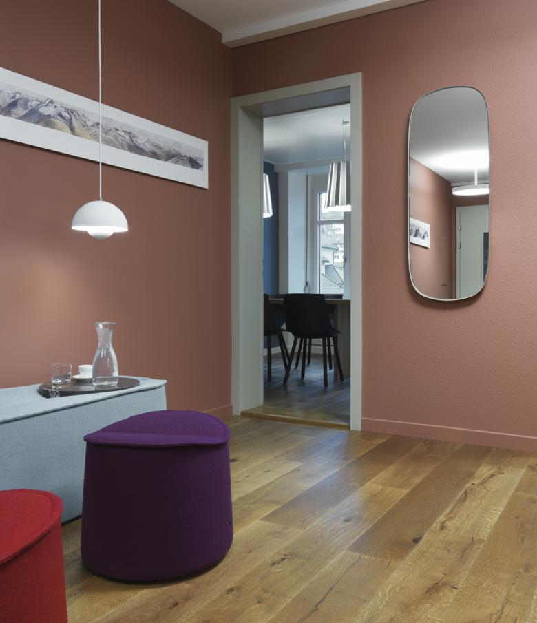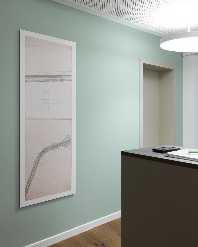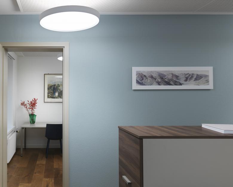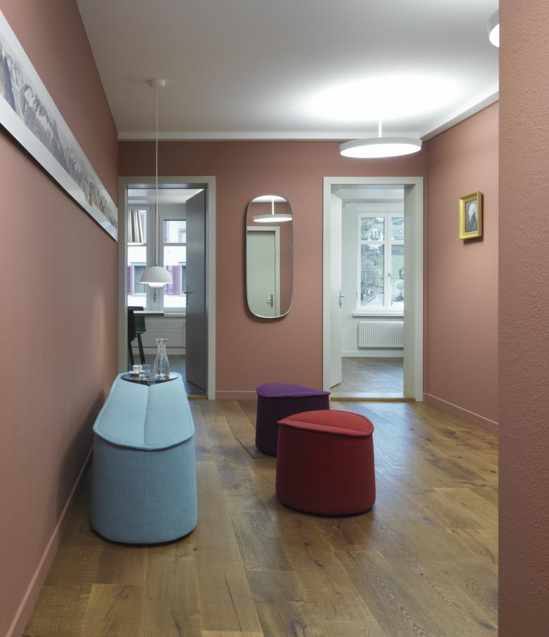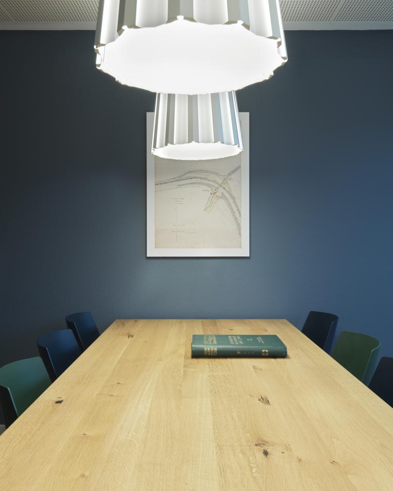 Die Geschichte des Linthkanals und die Pionierarbeit des Hans Konrad Eschers sind überall präsent in den Räumlichkeiten der Linthverwaltung, die historischen Bilder an den Wänden sind Zeitzeugen davon. Die Farben der Wände nehmen Bezug darauf und erzählen die Geschichte weiter: Im Entrée bildet ein warmer Braunton, der das Thema Landschaft aufnimmt, den Hintergrund für das Sidelhorn-Panorama. Das Blau des Sitzungszimmers versinnbildlicht das Wasser des Linthkanals. Farben, Leuchten und Möblierung sind aufeinander abgestimmt. Zum Umbaukonzept gehören auch eine Akustikdecke, ein neuer Parkettboden und die Erneuerung der elektrischen Installation.