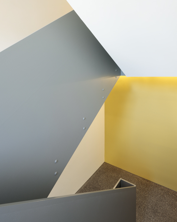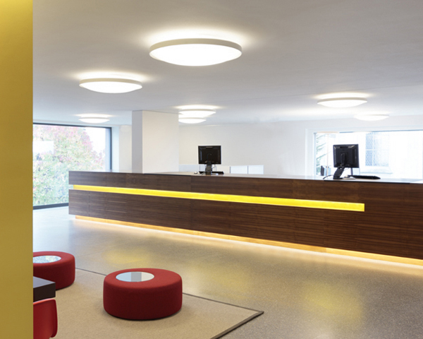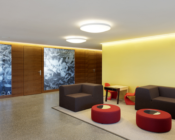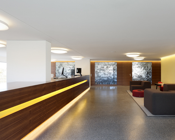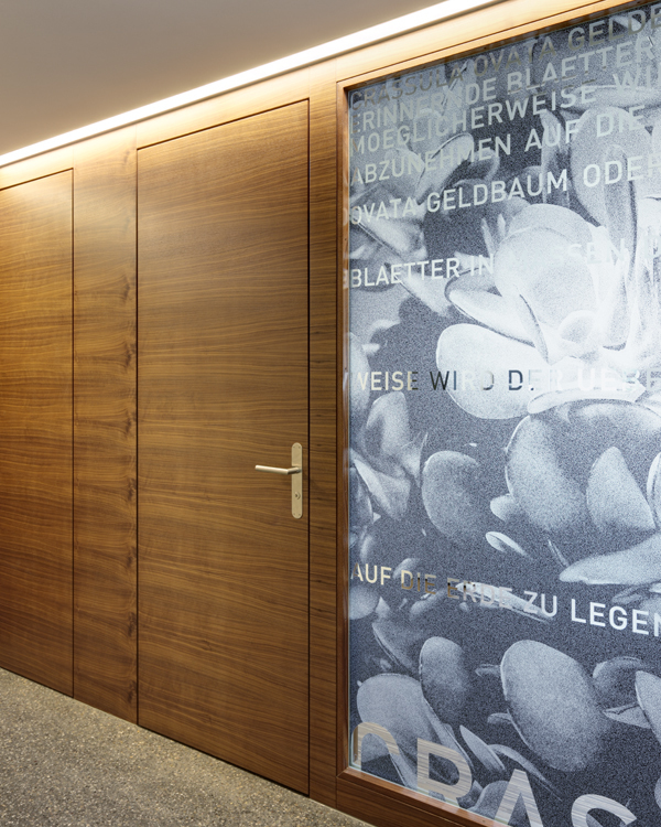 Ein auberginefarbener Betonkubus mit einem grossen Fenster markiert den neuen Eingang zur Bank. Der Anbau beherbergt eine offene Halle mit einer grosszügigen Empfangstheke und einem einladenden Wartebereich. In Nussbaumholz ausgeführt, scheint die Empfangstheke fest verankert. Doch die längs verlaufenden Lichtstreifen geben dem Möbel Leichtigkeit und bringen es beinahe zum Schweben. Im rückwärtigen Teil befinden sich die privaten Beratungszimmer. Die Trennwand dazu besteht aus Türen in Nussbaumholz im Wechsel mit bedruckten Fenstern. Diese erzählen die Geschichte der ‹Crassula Ovata›, des Geldbaumes, der als Symbol für die Vermögensvermehrung steht.