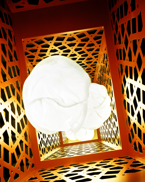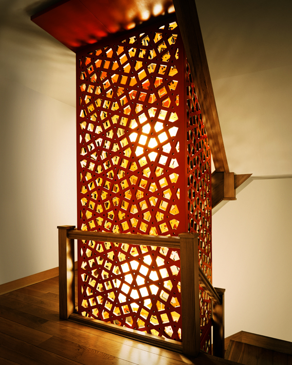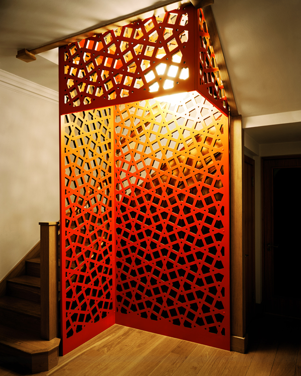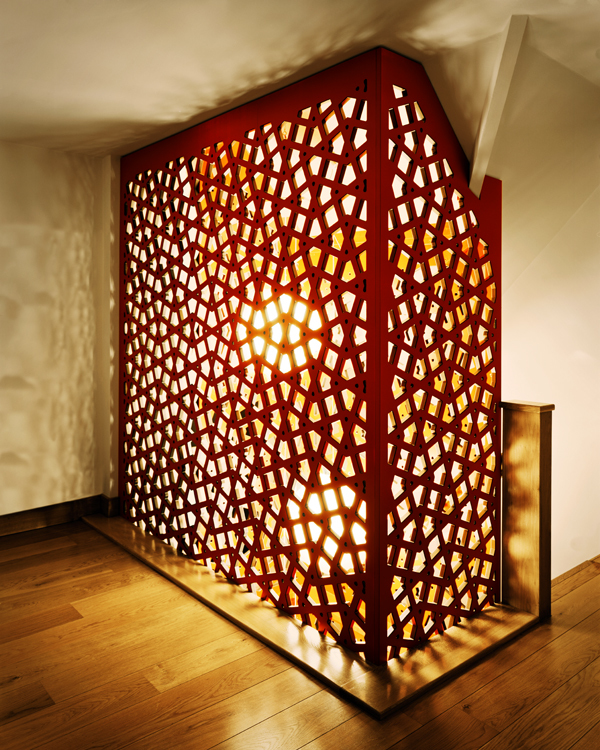 Selbstbewusst steht die rote Holzskulptur im Treppenraum des Londoner Stadthauses aus dem 19. Jh. Sie gibt dem Treppenauge in der Mitte eine Form. Die Installation ist die Antwort auf das Bedürfnis der Familie nach genügend Absturzsicherheit. Inspiriert von den typischen Sichtschutz-Spalieren der Hauseingänge der Umgebung, besteht die Konstruktion aus MDF-Platten, aus denen Lochmuster herausgelasert wurden. Die Platten wurden farbig gespritzt, wobei Seitenflächen und Schnittkanten in unterschiedlichen Farben ausgeführt sind. Während die Skulptur am Tag natürliches Licht durch die seitlichen Fenster erhält, leuchtet sie nachts einer Laterne gleich.