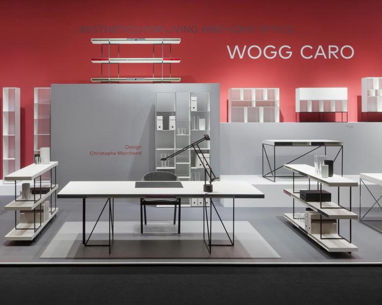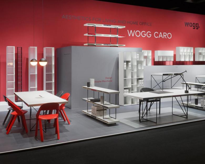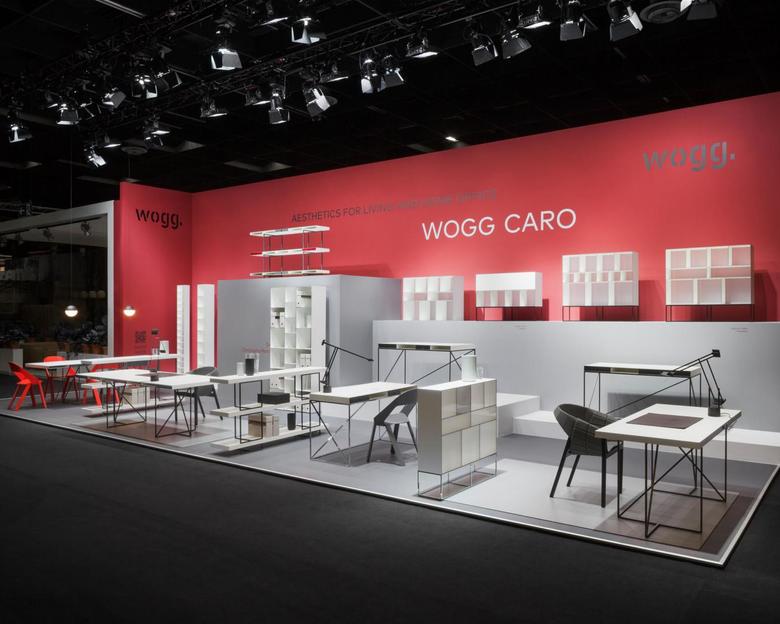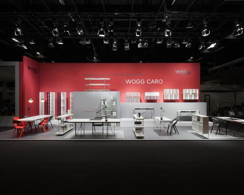 Eine abgewinkelte Wand bildet die Kulisse für die Präsentation der Möbel der Wogg Caro-Kollektion. Die Farbe Rot ist Hintergrund und Anziehungspunkt zugleich. Davor ist eine Landschaft aus unterschiedlich hohen, in verschiedenen Grautönen gehaltenen Podesten aufgebaut, die es ermöglicht, die Hauptakteure der Ausstellung auch mal von ungewohnter Seite zu betrachten, von unten oder aus nächster Nähe. Im vorderen Bereich des Standes entstehen durch die Anordnung der Regale kleine Arbeitsnischen, in denen die Ateliertische präsentiert werden. Die kubische Abwicklung der Podeste-Landschaft und die kantigen Formen der Möbel bilden eine gestalterische Einheit.