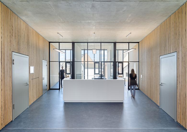 Das Pfarrzentrum setzt als Stadttor einen prominenten städtebaulichen Akzent im heterogenen Stadtraum. Drei große, vollflächig verglaste "Tore" öffnen sich sternförmig zum neu gestalteten Stadtplatz und treten in direkten Dialog mit dem bestehenden Umfeld. Sie bilden eine einladende Geste, die sich im Zentrum des zweigeschossigen Flachbaus konzentriert. Großzügige, lichtdurchflutete Räume führen in das Gebäudeinnere. Sie treffen in der Mitte zusammen und bilden ein gleichschenkliges Dreieck. Der anthrazitfarbene Boden greift den Platzbelag des Außenraumes auf und schafft so eine Verbindung zwischen Außen und Innen. Auch die Fassade des Pfarrzentrums setzt sich als Holzbekleidung im Innenraum fort: Schmale, raumhohe Paneele aus Baubuche prägen das Raumbild und verleihen ihm seine Atmosphäre.