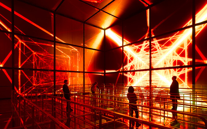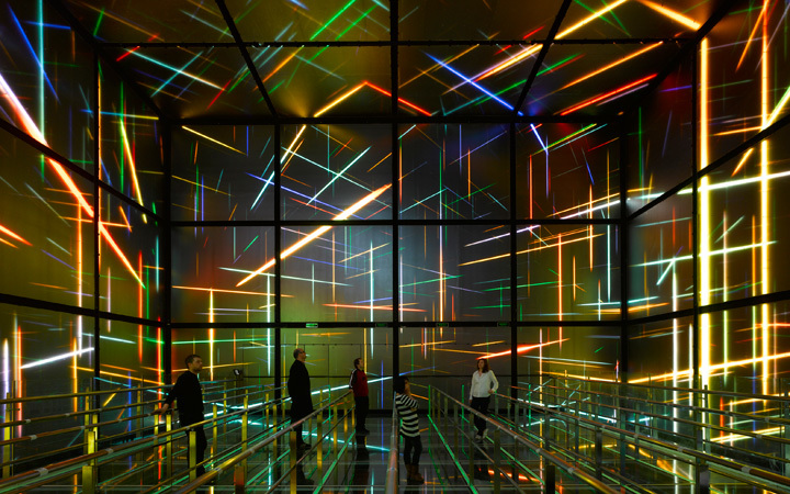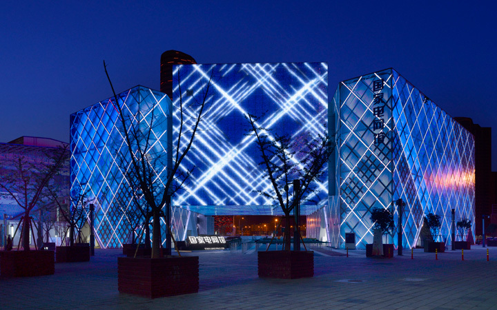 Better City - Better Life – Die Magic Box ist das pulsierende Herz des State Grid Pavillons. Von ihr gehen technische Impulse aus, die den gesamten Gebäudekomplex mit stromdurchfluteten Netzlinien umgreifen.