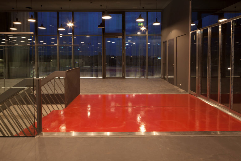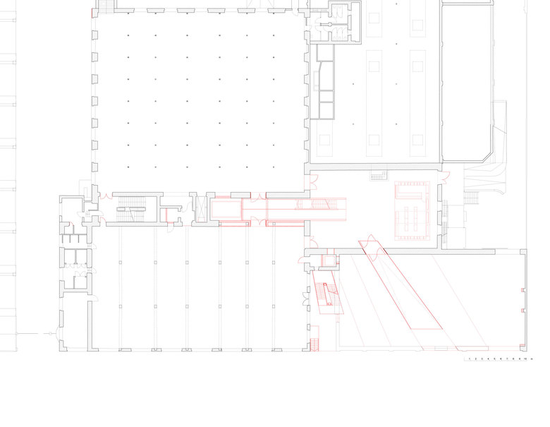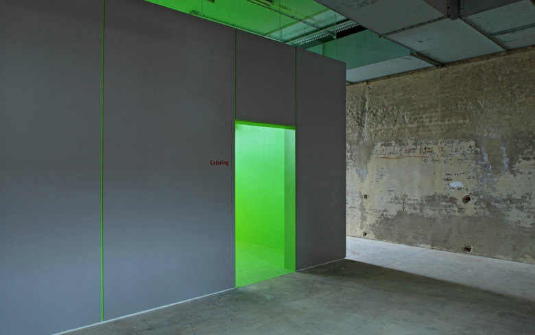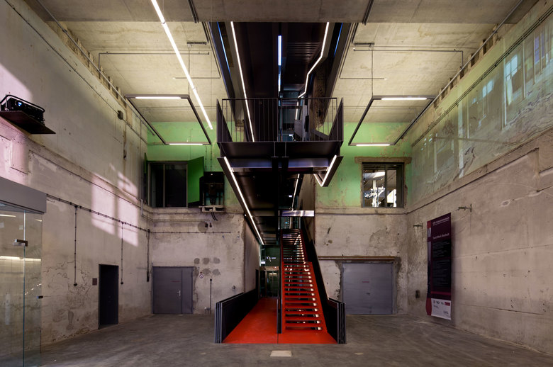 Ein Zwiegespräch zwischen aktueller Nutzung und historischem Bestand entwickelt sich auch auf den darunter liegenden vier Etagen des insgesamt rund 6000 Quadratmeter umfassenden Gebäudekomplexes. Zum Bestand, der als Zeitdokument mit all seinen Nutzungsspuren erlebbar bleibt, tritt eine gleichwertige, neue Zeitschicht. Die Funktionsräume, zu denen Shop, Counter, Garderobe, Catering und WC-Bereiche zählen, sind als eigenständige Elemente in den Industriebau eingebracht. Ihre hellgraue Oberfläche hebt sich von der heterogenen Umgebung ab, während ihr Inneres jeweils eine Farbe der historischen Raumfassung aufgreift: Blau, Rot, Grün, Weiß und Schwarz. Auch die mobile Möblierung setzt auf diese Farbtöne.