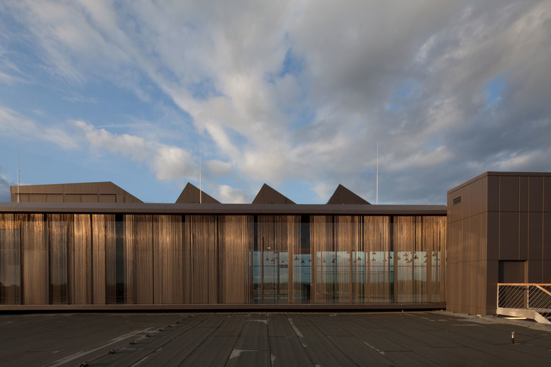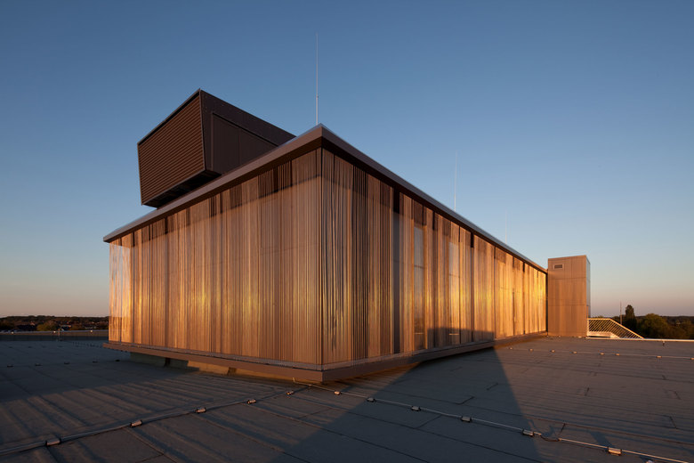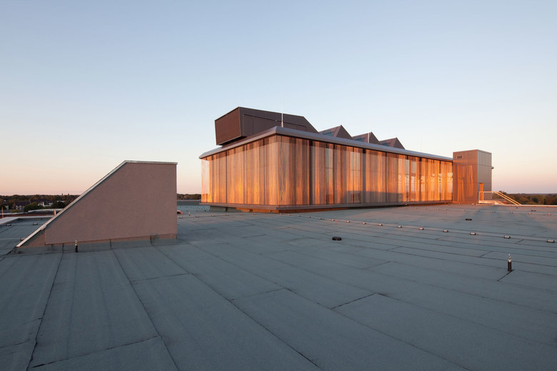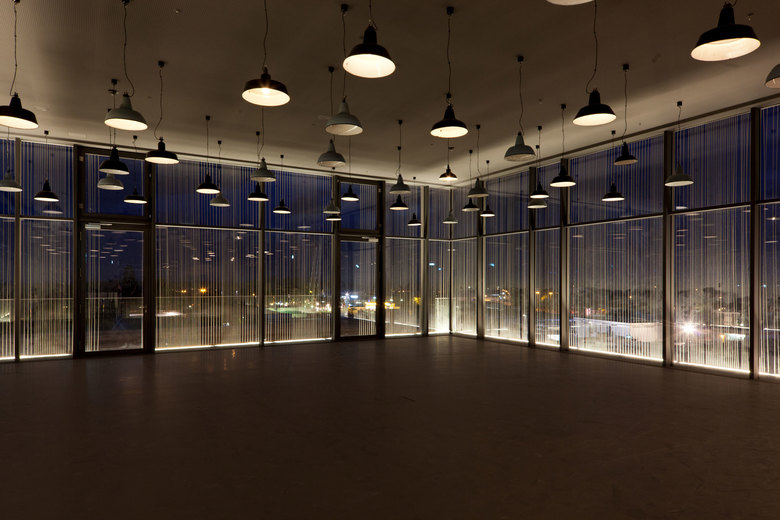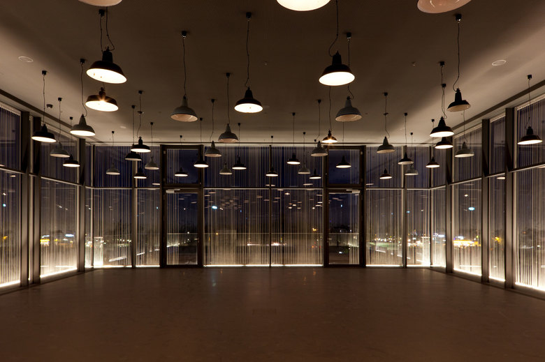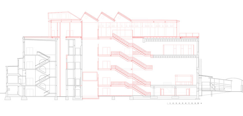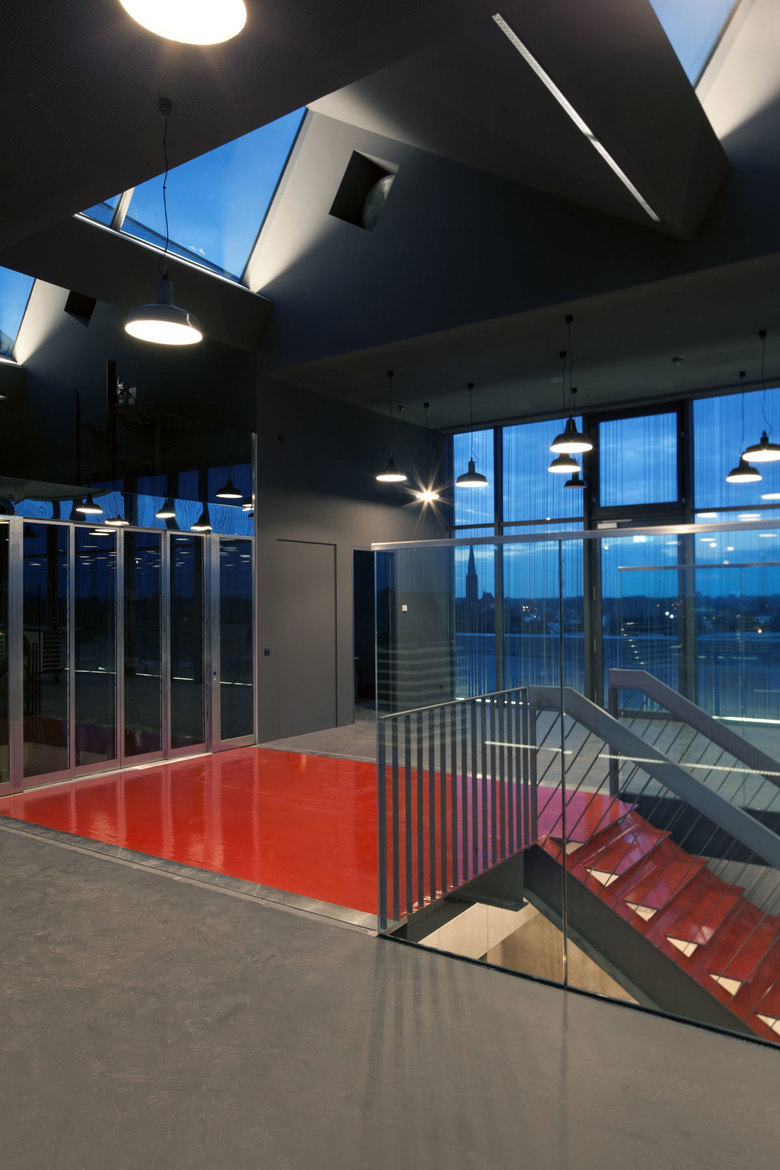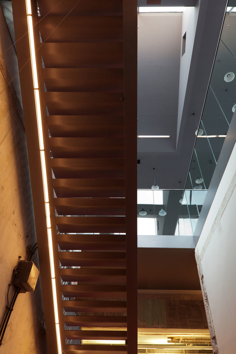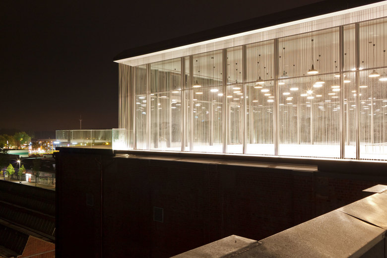 Als zentrales Erschließungselement dient eine rot akzentuierte Treppe, die in den 20 Meter hohen Seilgang der ehemaligen Fabrik eingebracht wurde. Über diese eröffnet sich das Gebäude nun entlang der ursprünglichen Energieachse: vom Kesselhaus (Erzeugung der Energie) über das Maschinenhaus (Umwandlung der Energie in Bewegung) und den Seilgang (Kraftübertragung) bis zu den großzügigen Spinnereisälen und der ehemaligen Technikzentrale auf dem Dach des Flachbaues (Absaugung der Luft). An ihre Stelle tritt nun ein luftiges Restaurant, dessen vorgehängte Fassade aus stählernen Fäden die Metaphorik der ehemaligen Spinnerei aufgreift. Im Inneren des neuen, gläsernen Kubus erinnert eine Installation aus 88 Deckenleuchten der 1950er Jahre an diese wichtige Zeitphase der Fabrik.