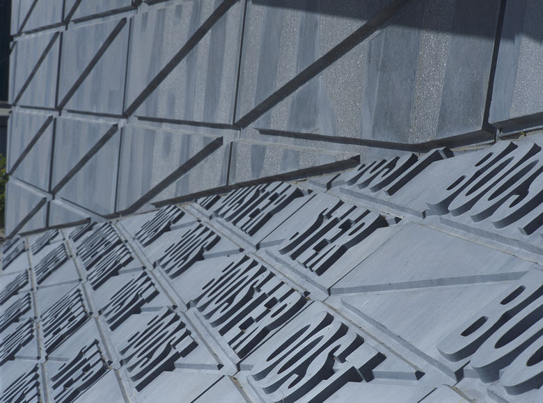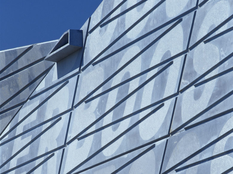 The building is executed in pigmented, prefabricated concrete, treated with a sand blasting technique to apply different depths. A bas-relief pattern wraps around the building like a web. A play of text patterns is moulded onto the base of the building. The pigmentation, the relief and texture treatments are done in such a way that the qualities of concrete are used in the most optimal way. It gives the concrete a refined and filigree look, with a beautiful deep, blue-green colour. The rich ornamentation is enhanced at night by small light fittings placed in the cantilevers. It illuminates the base of the building with a diffuse blue light and makes it glow at night.