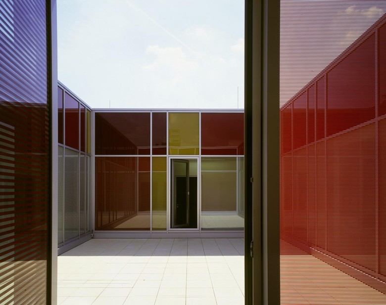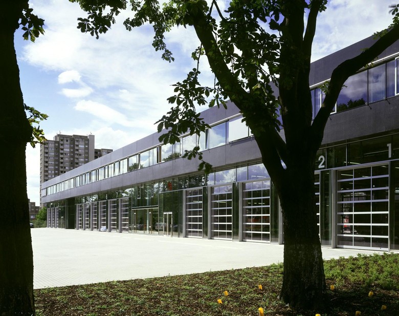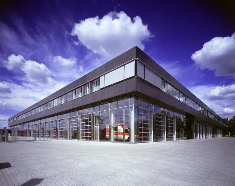 Aus organisatorischen und einsatztaktischen Überlegungen war für die Frankfurter Berufsfeuerwehr der Neubau eines integrierten Zentrums für den Brandschutz, Katastrophenschutz und Rettungsdienst erforderlich. Die besondere Aufgabe der Feuerwehr und das integrative Konzept des Zentrums bilden in den klassischen, architektonischen Metaphern - Hof - und - Dach - das architektonische Thema des Entwurfes. Das zweigeschossige Hauptgebäude gibt der Feuerwehr mit seinen klaren und eindeutigen Raumkanten eine noble Präsenz im Stadtraum, ohne seine Umgebung zu dominieren. Restaurant, Sporthalle und die Gästeappartements sind in einem separaten Baukörper angeordnet. Diese Räume sind sowohl für außerbetriebliche Veranstaltungen als auch für den Einsatz im Katastrophenfall vorgesehen. Die Fassaden der beiden Baukörper sind gekennzeichnet durch den Gegensatz der schwebenden Horizontalen des Hauptgebäudes, betont durch die schwarzen, polierten Betonfertigteile und den kubischen Charakter des zweiten Baukörpers aus weißem Putz.