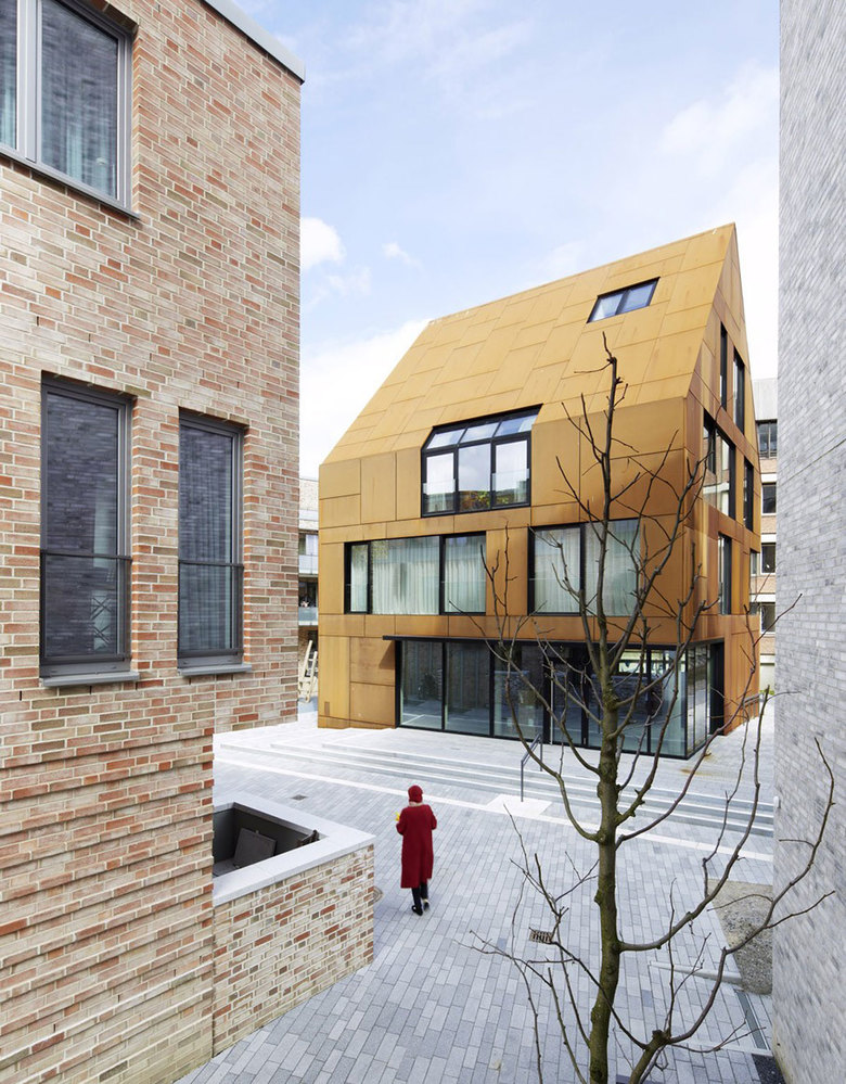 Südlich, dem Kulturdenkmal „Warleberger Hof“ benachbart, bildet ein vollständig mit Cortenstahl bekleidetes Satteldachhaus mit zwei exklusiven Loftwohnungen und einer Gewerbeeinheit im Erdgeschoss eine eigenständigen Akzent und markiert den städtischen Zugang zum Quartier.