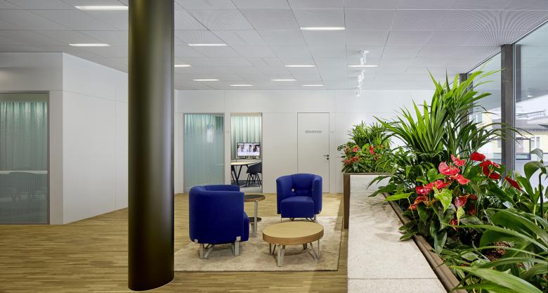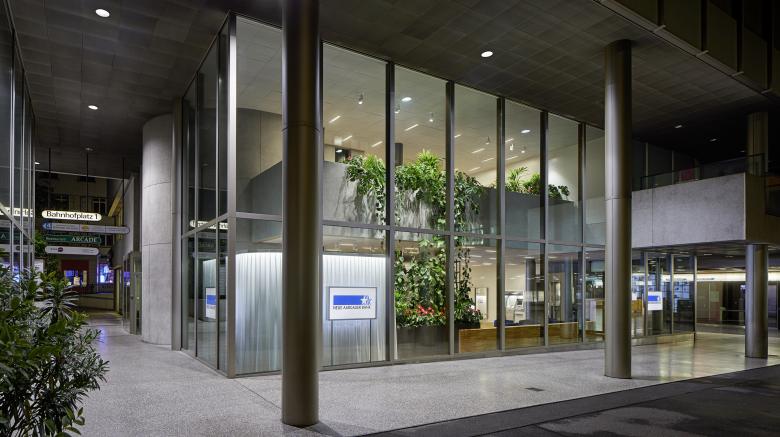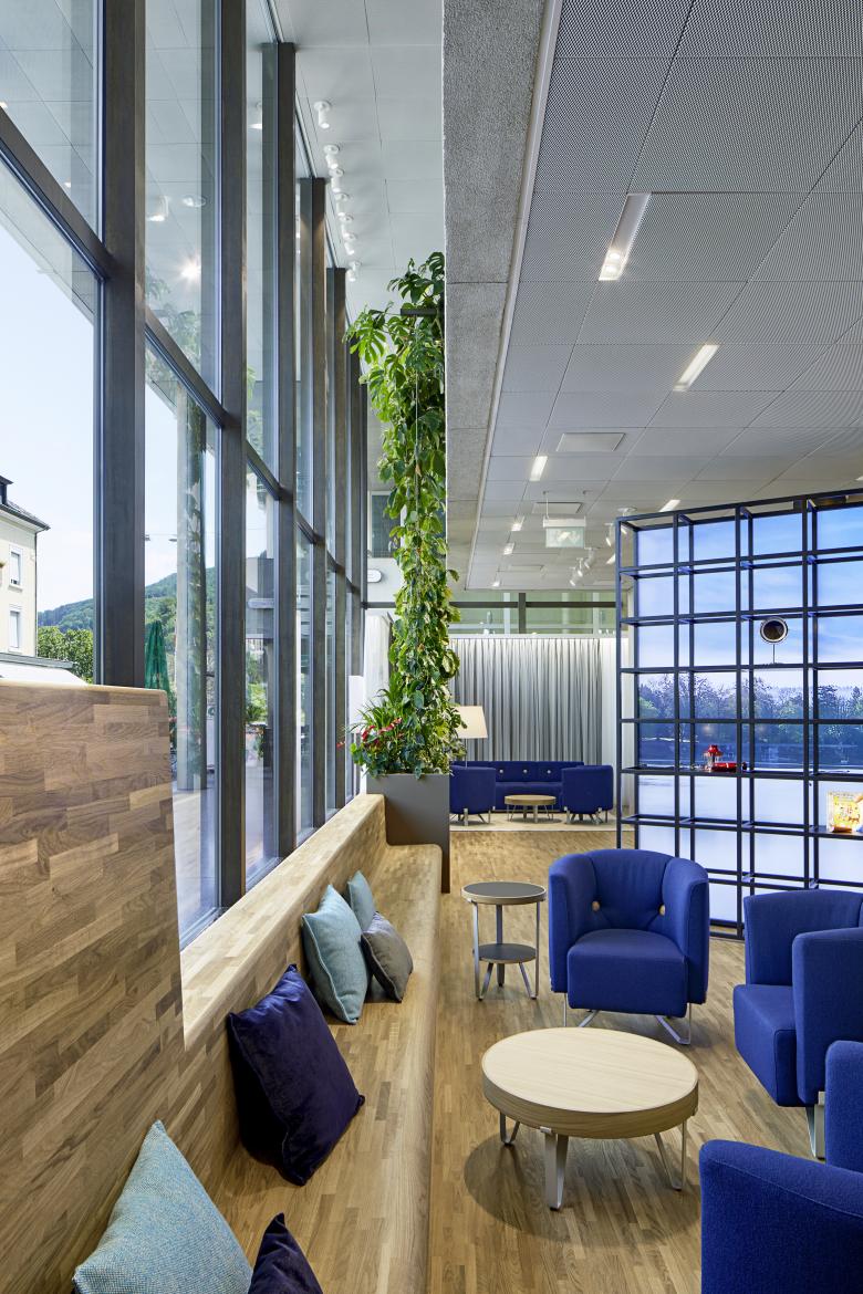 Der Waschbeton und die Treppenbeleuchtung sind Zeitzeugen, die sich heute wunderbar mit dem neuen Konzept verbinden. Die Begrünung unterstreicht die Wohnlichkeit des Raumes und trägt seiner Historie Rechnung: Pflanzen winden sich von der Kundenhalle nach oben zur Galerie. So ist es gelungen, klassische Elemente mit modernstem Design und neuster Technologie zu ergänzen und damit für einen zeitgemässen Auftritt der grössten Regionalbank der Schweiz zu sorgen, der ausgezeichnet zu ihrer Positionierung „lokal und digital“ passt.