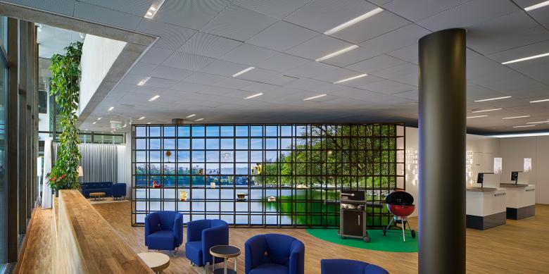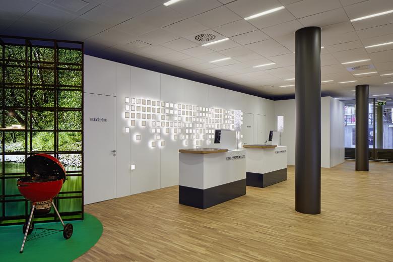 in einem charakteristischen 70er-Jahre Bau umzusetzen. Neu kommt hier eine akustische Komponente hinzu: Die Kunden sind von einer inspirierenden Klangwelt umgeben, welche die verschiedenen Kundenzonen gezielt atmosphärisch einbettet.